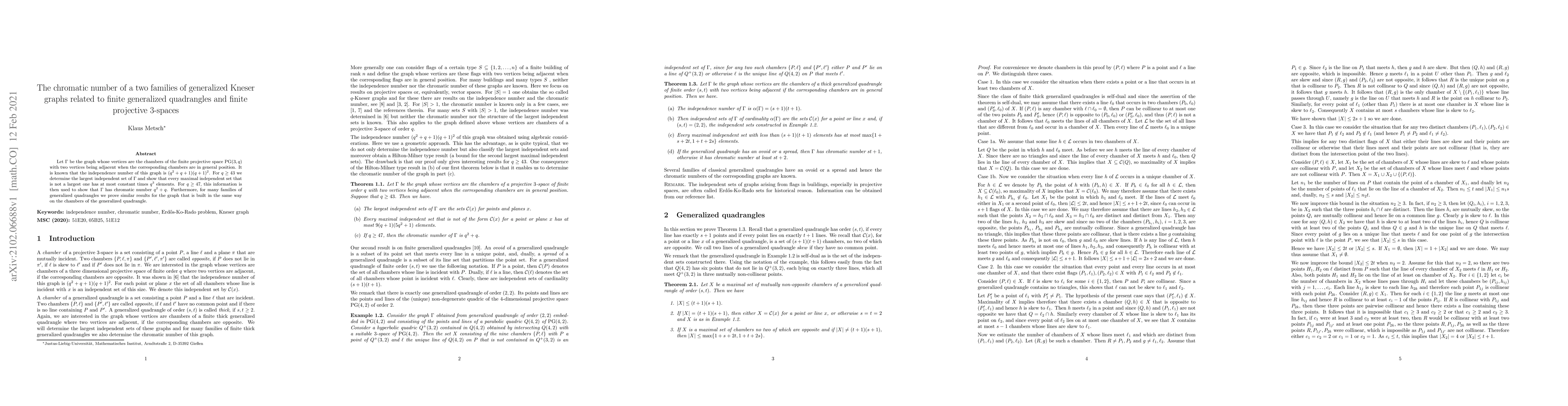 The paper determines the chromatic number of a graph related to finite generalized quadrangles and projective 3-spaces for certain values of q, showing that it has a limited number of colors needed to color its vertices.