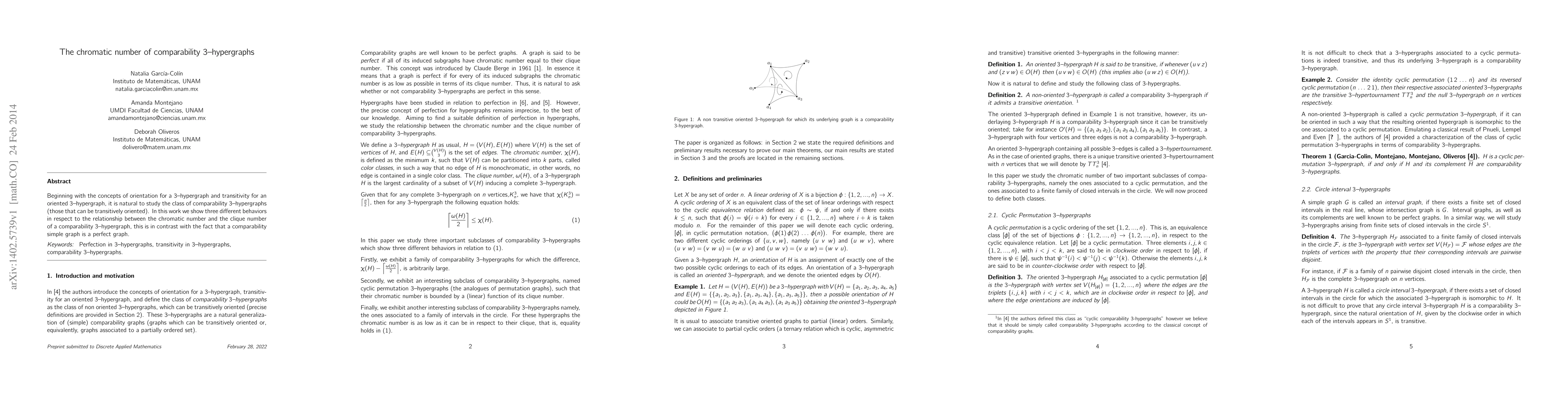 Beginning with the concepts of orientation for a 3-hypergraph and transitivity for an oriented 3-hypergraph, it is natural to study the class of comparability 3-hypergraphs (those that can be transitively oriented). In this work we show three different behaviors in respect to the relationship between the chromatic number and the clique number of a comparability 3-hypergraph, this is in contrast with the fact that a comparability simple graph is a perfect graph.