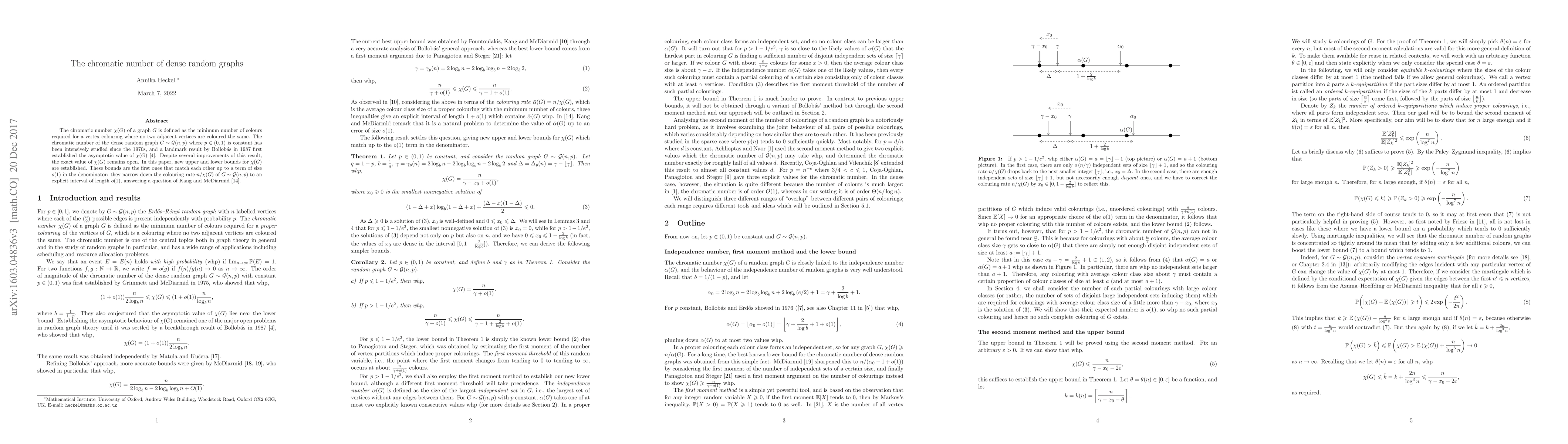 This paper establishes new upper and lower bounds for the chromatic number of dense random graphs $G \sim G(n,p)$, matching each other up to a term of size $o(1)$ and narrowing the colouring rate to an explicit interval of length $o(1)$. This resolves a question posed by Kang and McDiarmid.