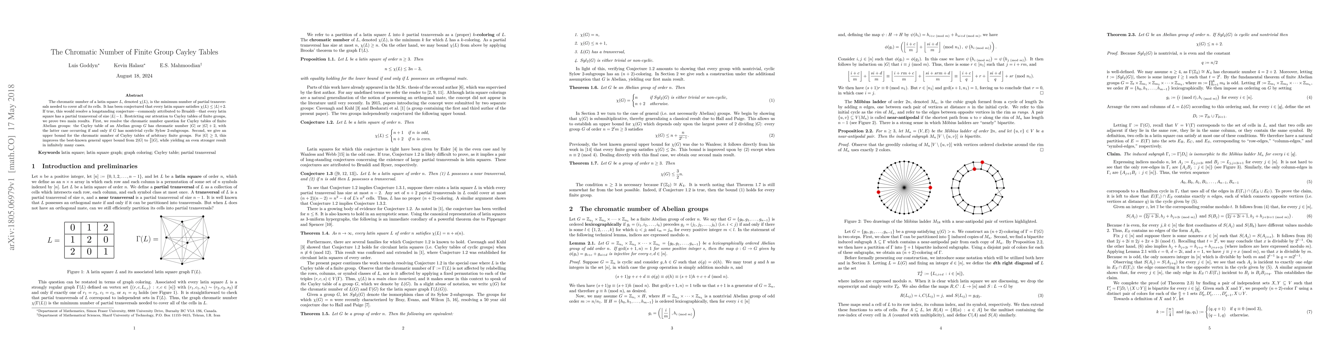This research contributes to the longstanding conjecture about the chromatic number of latin squares, offering insights into the structure of finite groups through Cayley tables, which has implications in group theory, combinatorics, and coding theory.