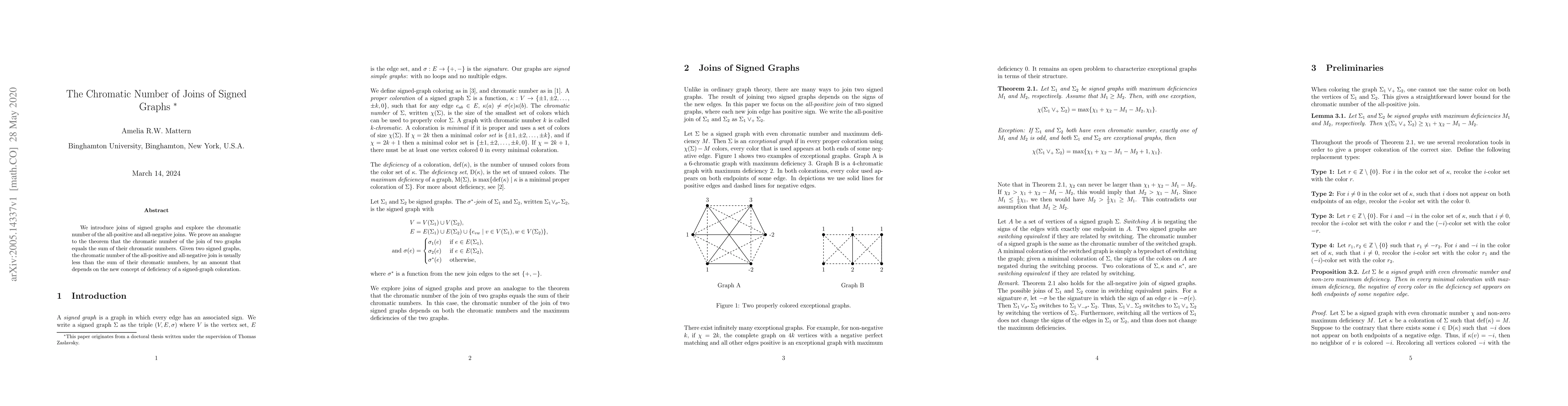 Summary: This paper introduces joins of signed graphs and investigates their chromatic numbers, proving a relationship analogous to the join of two graphs where the chromatic number typically decreases by a quantity defined as deficiency of signed-graph coloration.