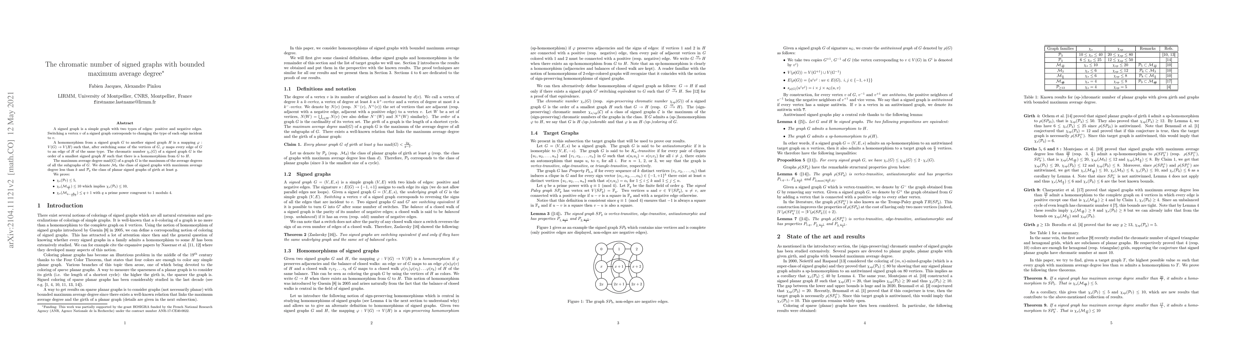 A signed graph is a simple graph with two types of edges: positive and negative edges. Switching a vertex $v$ of a signed graph corresponds to changing the type of each edge incident to $v$. A homomorphism from a signed graph $G$ to another signed graph $H$ is a mapping $\varphi: V(G) \rightarrow V(H)$ such that, after switching some of the vertices of $G$, $\varphi$ maps every edge of $G$ to an edge of $H$ of the same type. The chromatic number $\chi_s(G)$ of a signed graph $G$ is the order of a smallest signed graph $H$ such that there is a homomorphism from $G$ to $H$. The maximum average degree $mad(G)$ of a graph $G$ is the maximum of the average degrees of all the subgraphs of $G$. We denote $\mathcal{M}_k$ the class of signed graphs with maximum average degree less than $k$ and $\mathcal{P}_g$ the class of planar signed graphs of girth at least $g$. We prove: $\chi_s(\mathcal{P}_{7}) \le 5$, $\chi_s(\mathcal{M}_{\frac{17}{5}}) \le 10$ which implies $\chi_s(\mathcal{P}_{5}) \le 10$, $\chi_s(\mathcal{M}_{4-\frac{8}{q+3}}) \le q+1$ with $q$ a prime power congruent to 1 modulo 4.
