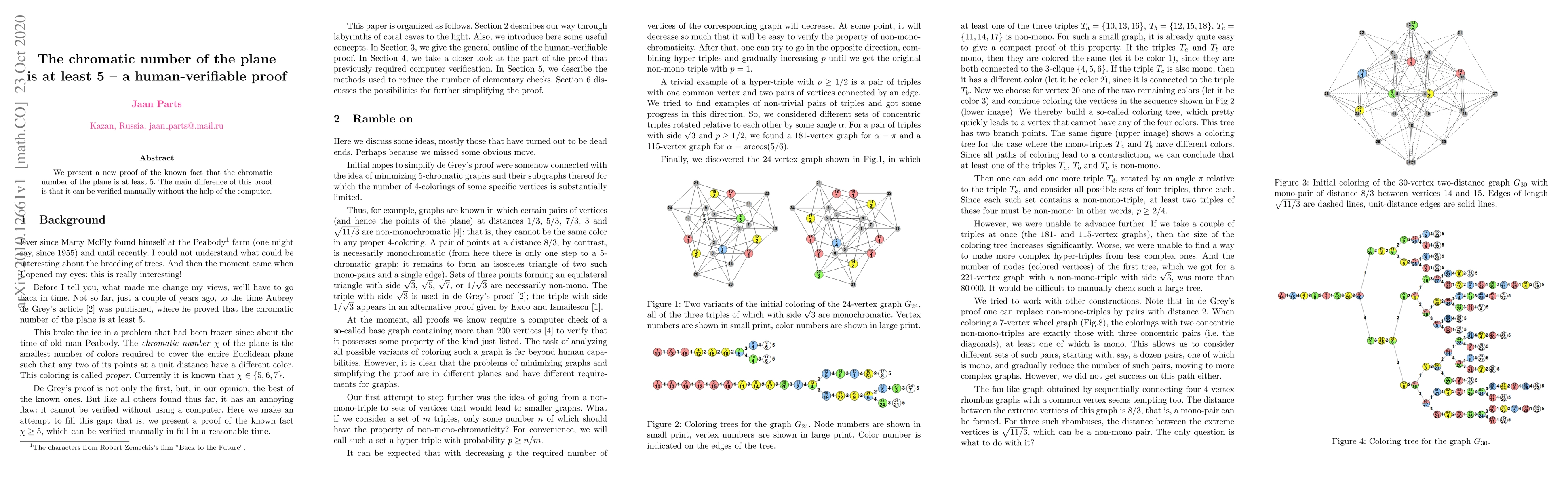 Summary: This paper provides a new proof that the chromatic number of the plane is at least 5, emphasizing its verifiability by humans without computational assistance. The proof aims to offer a more intuitive understanding of the problem.