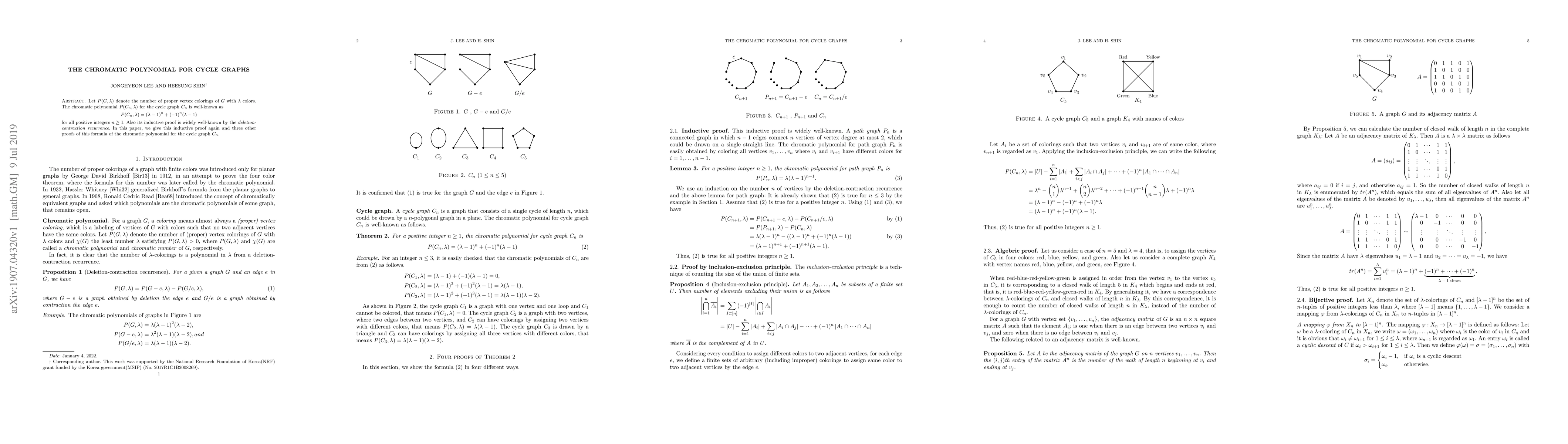 Let $P(G,\lambda)$ denote the number of proper vertex colorings of $G$ with $\lambda$ colors. The chromatic polynomial $P(C_n,\lambda)$ for the cycle graph $C_n$ is well-known as $$P(C_n,\lambda) = (\lambda-1)^n+(-1)^n(\lambda-1)$$ for all positive integers $n\ge 1$. Also its inductive proof is widely well-known by the \emph{deletion-contraction recurrence}. In this paper, we give this inductive proof again and three other proofs of this formula of the chromatic polynomial for the cycle graph $C_n$.