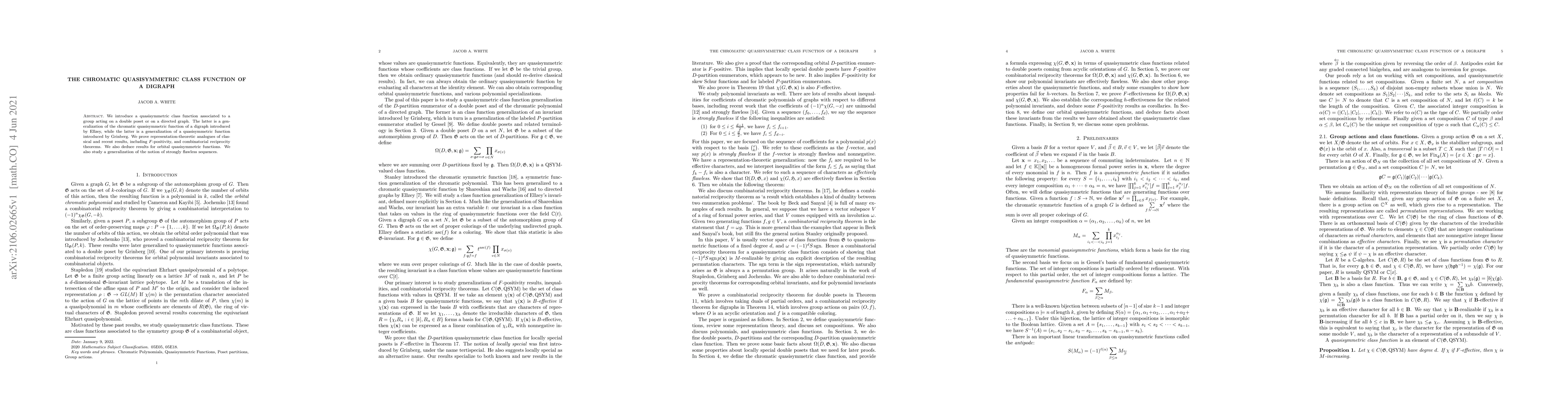 Summary: This paper introduces a quasisymmetric class function linked to a group acting on a directed graph, generalizing both the chromatic quasisymmetric function and existing quasisymmetric functions. It proves representation-theoretic results, including $F$-positivity and combinatorial reciprocity theorems, and explores orbital quasisymmetric functions and a notion of strongly flawless sequences.
