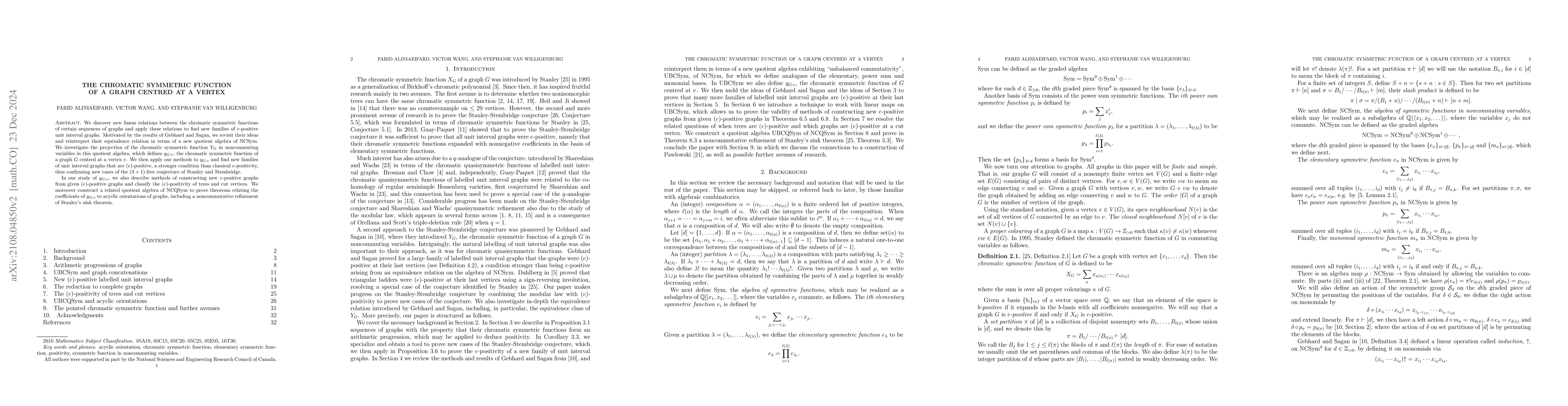 We discover new linear relations between the chromatic symmetric functions of certain sequences of graphs and apply these relations to find new families of $e$-positive unit interval graphs. Motivated by the results of Gebhard and Sagan, we revisit their ideas and reinterpret their equivalence relation in terms of a new quotient algebra of NCSym. We investigate the projection of the chromatic symmetric function $Y_G$ in noncommuting variables in this quotient algebra, which defines $y_{G : v}$, the chromatic symmetric function of a graph $G$ centred at a vertex $v$. We then apply our methods to $y_{G : v}$ and find new families of unit interval graphs that are $(e)$-positive, a stronger condition than classical $e$-positivity, thus confirming new cases of the $(3+1)$-free conjecture of Stanley and Stembridge. In our study of $y_{G : v}$, we also describe methods of constructing new $e$-positive graphs from given $(e)$-positive graphs and classify the $(e)$-positivity of trees and cut vertices. We moreover construct a related quotient algebra of NCQSym to prove theorems relating the coefficients of $y_{G : v}$ to acyclic orientations of graphs, including a noncommutative refinement of Stanley's sink theorem.