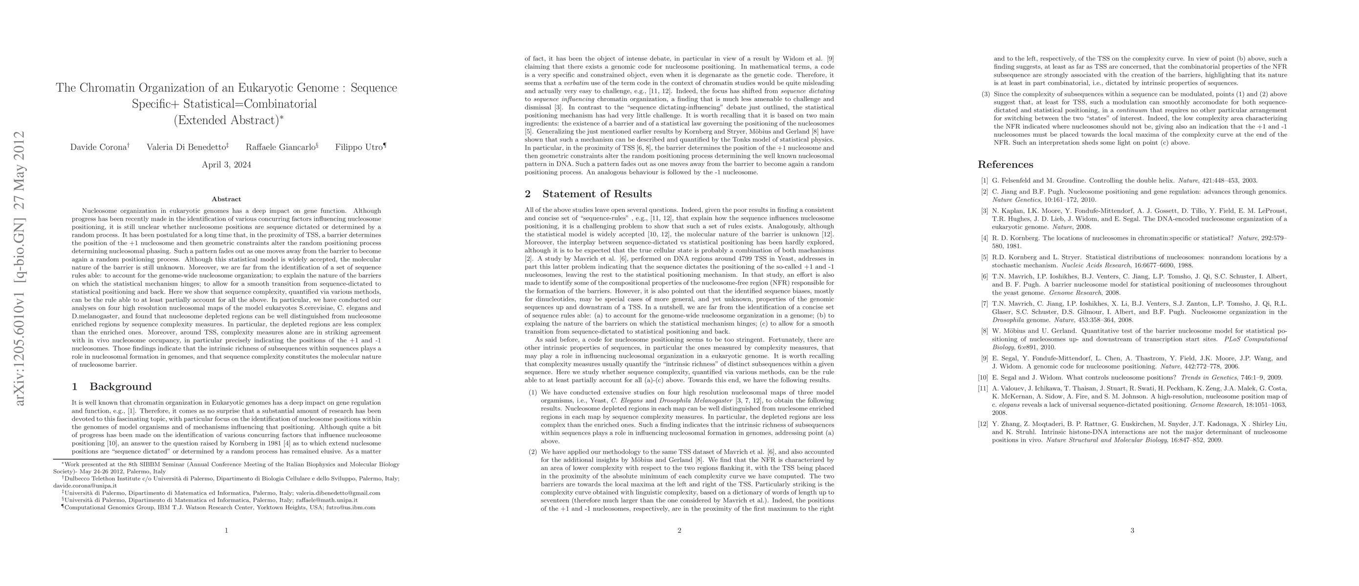 This paper explores the chromatin organization of eukaryotic genomes, focusing on nucleosome positioning. It finds that sequence complexity, rather than a purely random process, significantly influences nucleosome organization, particularly near transcription start sites (TSS). The study identifies sequence complexity as a key factor in distinguishing nucleosome-depleted from nucleosome-enriched regions, suggesting it may define nucleosome barriers.