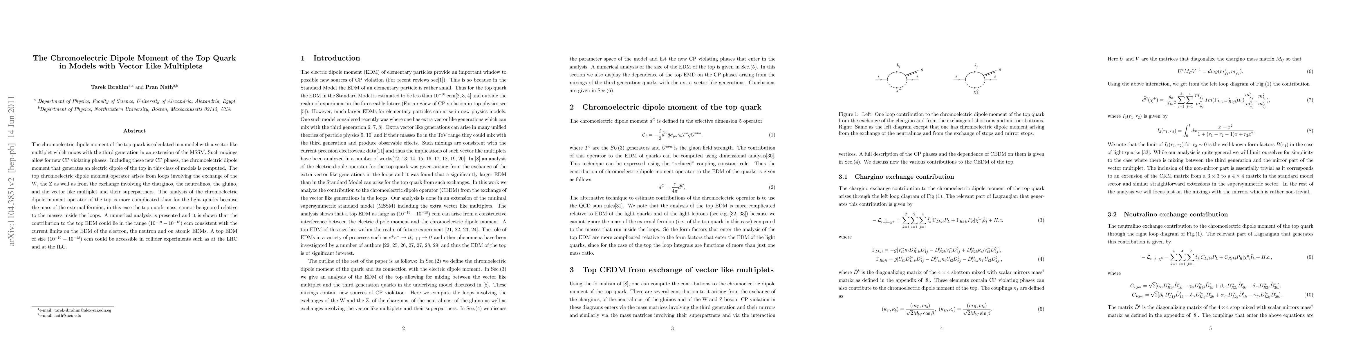 The chromoelectric dipole moment of the top quark is calculated in a model with a vector like multiplet which mixes with the third generation in an extension of the MSSM. Such mixings allow for new CP violating phases. Including these new CP phases, the chromoelectric dipole moment that generates an electric dipole of the top in this class of models is computed. The top chromoelectric dipole moment operator arises from loops involving the exchange of the W, the Z as well as from the exchange involving the charginos, the neutralinos, the gluino, and the vector like multiplet and their superpartners. The analysis of the chromoelectric dipole moment operator of the top is more complicated than for the light quarks because the mass of the external fermion, in this case the top quark mass, cannot be ignored relative to the masses inside the loops. A numerical analysis is presented and it is shown that the contribution to the top EDM could lie in the range ($10^{-19}-10^{-18})$ ecm consistent with the current limits on the EDM of the electron, the neutron and on atomic EDMs. A top EDM of size $(10^{-19}-10^{-18})$ ecm could be accessible in collider experiments such as at the LHC and at the ILC.