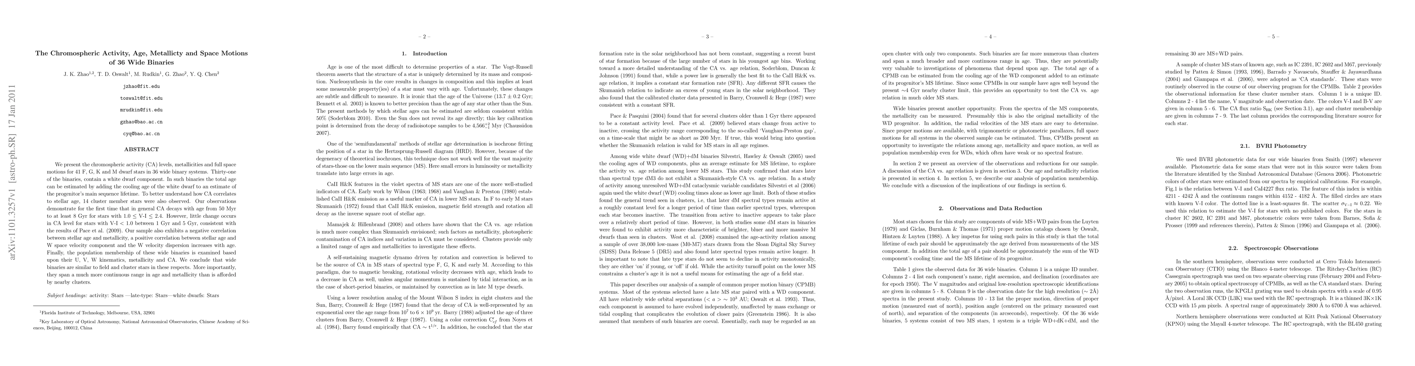 This study investigates chromospheric activity, age, metallicity, and space motions in 36 wide binary systems containing 41 F, G, K, and M dwarf stars, with 31 having white dwarf components. The findings show that chromospheric activity generally decreases with age, with little change for stars with V-I < 1.0 between 1 Gyr and 5 Gyr. The research also reveals a negative correlation between stellar age and metallicity, and a positive correlation between age and W space velocity component.