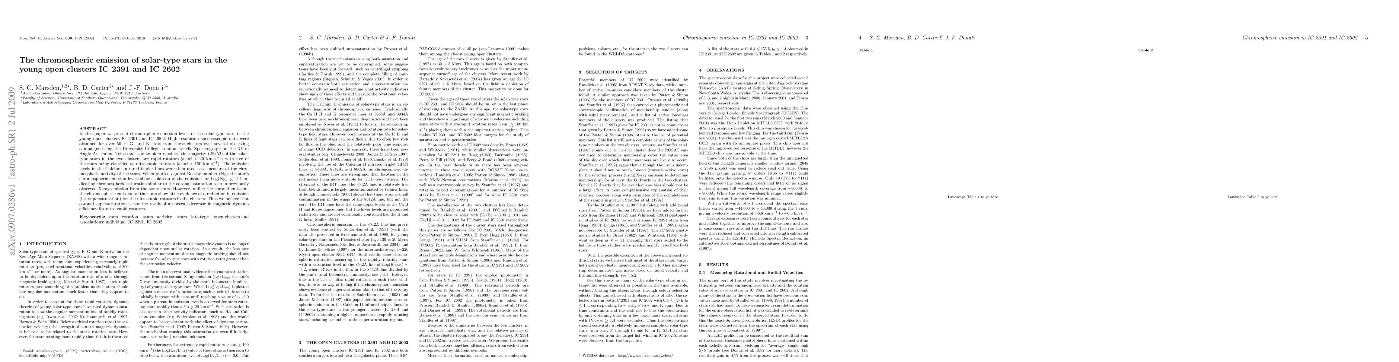 In this paper we present chromospheric emission levels of the solar-type stars in the young open clusters IC 2391 and IC 2602. High resolution spectroscopic data were obtained for over 50 F, G, and K stars from these clusters over several observing campaigns using the University College London Echelle Spectrograph on the 3.9-m Anglo-Australian Telescope. Unlike older clusters, the majority (28/52) of the solar-type stars in the two clusters are rapid-rotators (vsini > 20 km/s) with five of the stars being classified as ultra-rapid rotators (vsini > 100 km/s). The emission levels in the Calcium infrared triplet lines were then used as a measure of the chromospheric activity of the stars. When plotted against Rossby number (NR) the star's chromospheric emission levels show a plateau in the emission for Log(NR) < -1.1 indicating chromospheric saturation similar to the coronal saturation seen in previously observed X-ray emission from the same stars. However, unlike the coronal emission, the chromospheric emission of the stars show little evidence of a reduction in emission (i.e. supersaturation) for the ultra-rapid rotators in the clusters. Thus we believe that coronal supersaturation is not the result of an overall decrease in magnetic dynamo efficiency for ultra-rapid rotators.