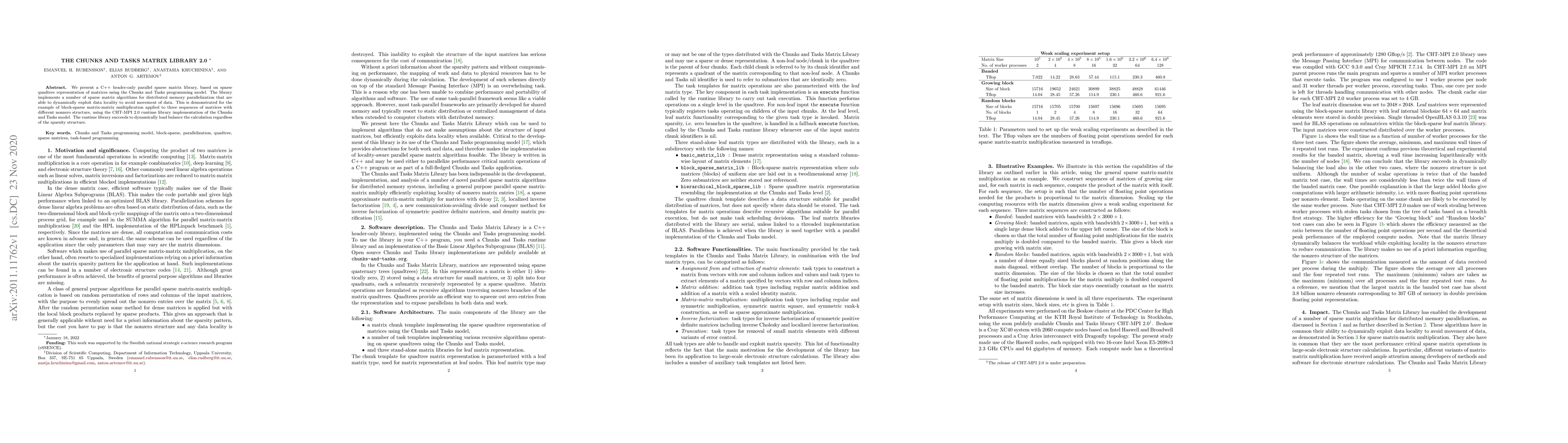 The Chunks and Tasks Matrix Library 2.0 is a C++ header-only parallel sparse matrix library utilizing a quadtree representation and dynamic data locality to optimize distributed memory parallelization. It demonstrates effective load balancing and performance in block-sparse matrix-matrix multiplication using the CHT-MPI 2.0 runtime library.