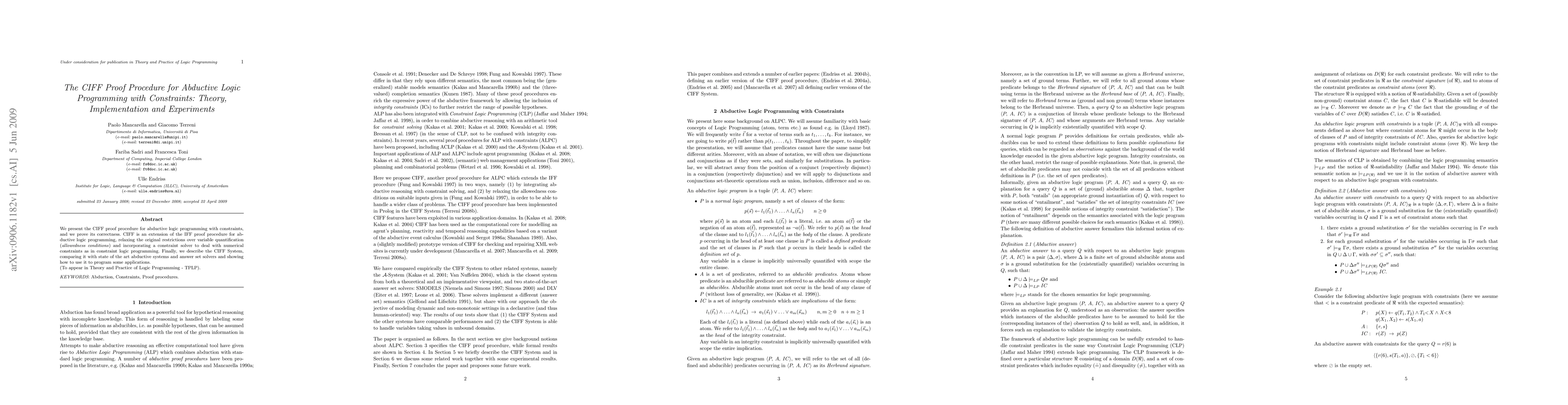 Researchers present a proof procedure called CIFF for abductive logic programming with constraints, demonstrating its correctness and comparing it to existing systems.
