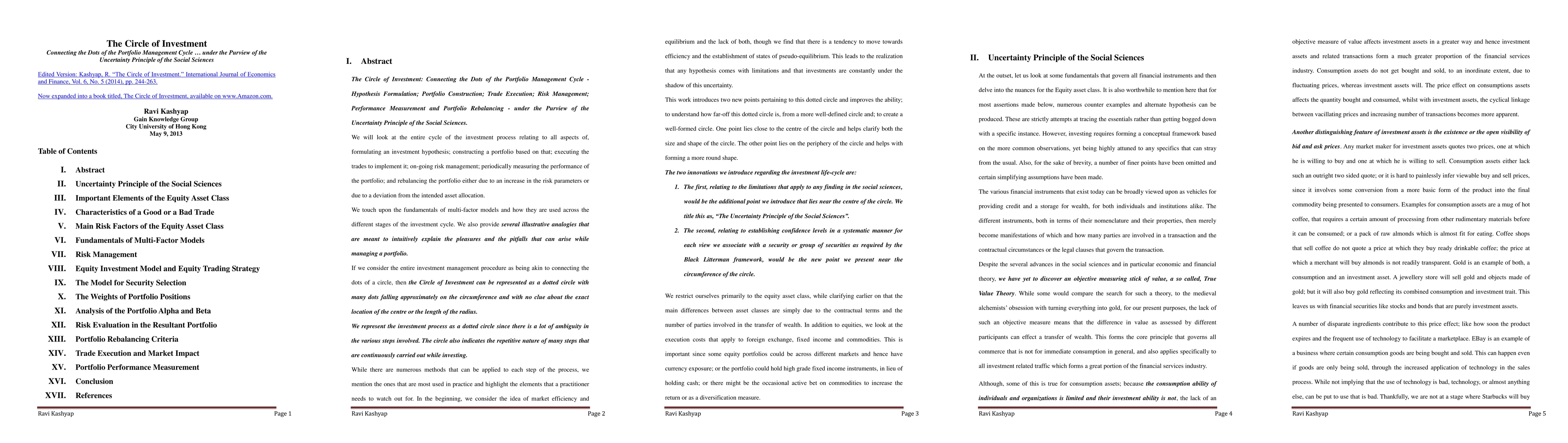 We will look at the entire cycle of the investment process relating to all aspects of, formulating an investment hypothesis, constructing a portfolio based on that, executing the trades to implement it, on-going risk management, periodically measuring the performance of the portfolio, and rebalancing the portfolio either due to an increase in the risk parameters or due to a deviation from the intended asset allocation. We provide several illustrative analogies that are meant to intuitively explain the pleasures and the pitfalls that can arise while managing a portfolio. If we consider the entire investment management procedure as being akin to connecting the dots of a circle, then the Circle of Investment can be represented as a dotted circle with many dots falling approximately on the circumference and with no clue about the exact location of the centre or the length of the radius. We represent the investment process as a dotted circle since there is a lot of ambiguity in the various steps involved. The circle also indicates the repetitive nature of many steps that are continuously carried out while investing. This work introduces two new points pertaining to this dotted circle and improves the ability, to understand how far-off this dotted circle is, from a more well-defined circle and, to create a well-formed circle. The two innovations we introduce are: 1. The first, relating to the limitations that apply to any finding in the social sciences, would be the additional point we introduce that lies near the centre of the circle. We title this as, 'The Uncertainty Principle of the Social Sciences'. 2. The second, relating to establishing confidence levels in a systematic manner for each view we associate with a security or group of securities as required by the Black-Litterman framework, would be the new point we present near the circumference of the circle.