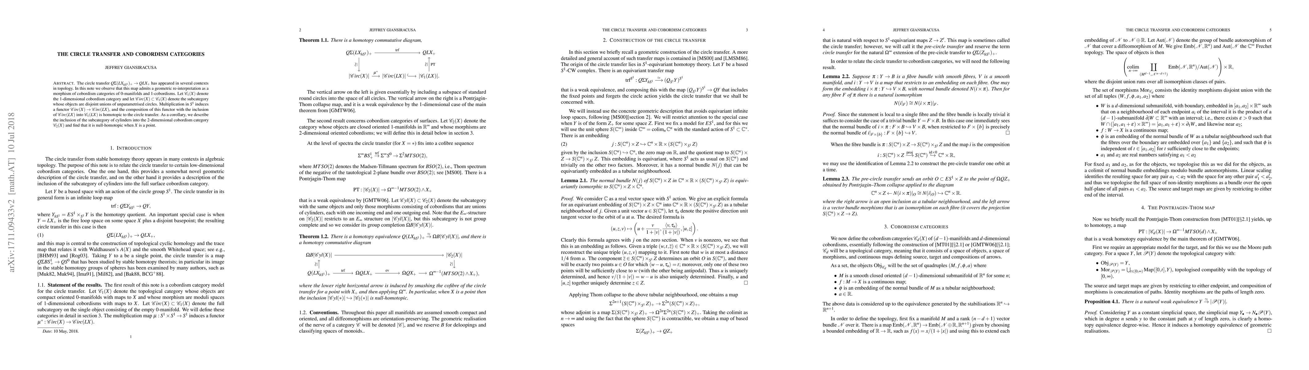 The circle transfer $Q\Sigma (LX_{hS^1})_+ \to QLX_+$ has appeared in several contexts in topology. In this note we observe that this map admits a geometric re-interpretation as a morphism of cobordism categories of 0-manifolds and 1-cobordisms. Let $C_1(X)$ denote the 1-dimensional cobordism category and let $Circ(X) \subset C_1(X)$ denote the subcategory whose objects are disjoint unions of unparametrised circles in $\mathbb{R}^\infty$. Multiplication in $S^1$ induces a functor $Circ(X) \to Circ(LX)$, and the composition of this functor with the inclusion of $Circ(LX)$ into $C_1(LX)$ is homotopic to the circle transfer. As a corollary, we describe the inclusion of the subcategory of cylinders into the 2-dimensional cobordism category $C_2(X)$ and find that it is null-homotopic when $X$ is a point.