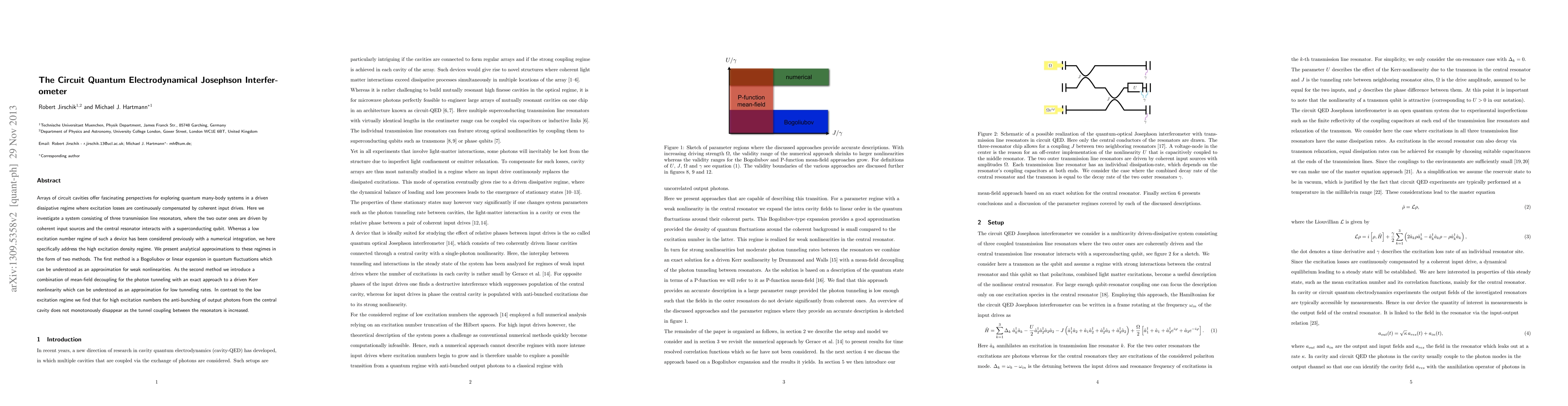 Arrays of circuit cavities offer fascinating perspectives for exploring quantum many-body systems in a driven dissipative regime where excitation losses are continuously compensated by coherent input drives. Here we investigate a system consisting of three transmission line resonators, where the two outer ones are driven by coherent input sources and the central resonator interacts with a superconducting qubit. Whereas a low excitation number regime of such a device has been considered previously with a numerical integration, we here specifically address the high excitation density regime. We present analytical approximations to these regimes in the form of two methods. The first method is a Bogoliubov or linear expansion in quantum fluctuations which can be understood as an approximation for weak nonlinearities. As the second method we introduce a combination of mean-field decoupling for the photon tunneling with an exact approach to a driven Kerr nonlinearity which can be understood as an approximation for low tunneling rates. In contrast to the low excitation regime we find that for high excitation numbers the anti-bunching of output photons from the central cavity does not monotonously disappear as the tunnel coupling between the resonators is increased.