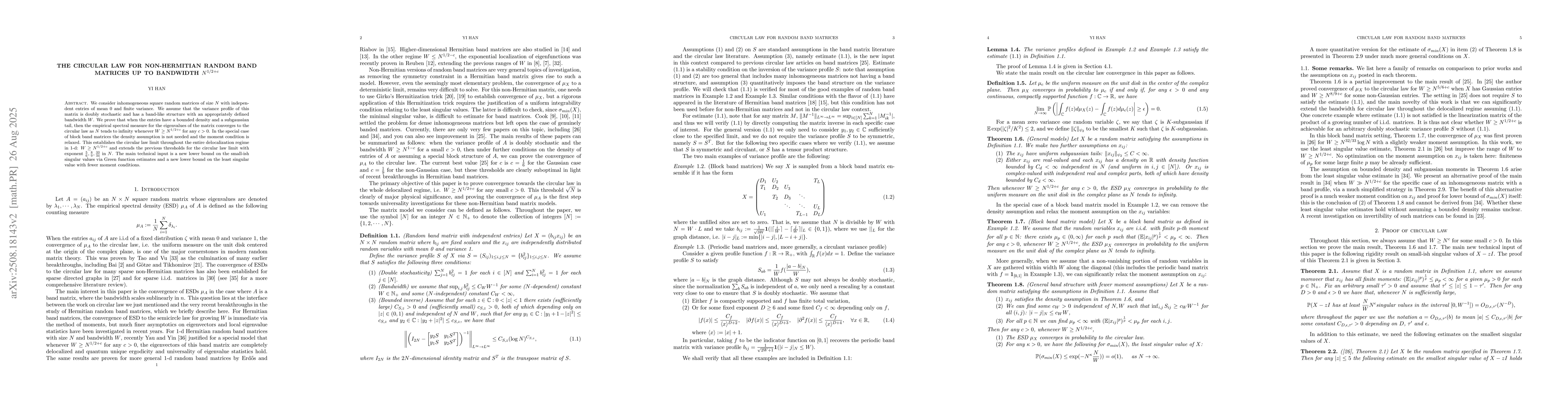 We consider inhomogeneous square random matrices of size $N$ with independent entries of mean 0 and finite variance. We assume that the variance profile of this matrix is doubly stochastic and has a band-like structure with an appropriately defined bandwidth $W$. We prove that when the entries have a bounded density and a subgaussian tail, then the empirical spectral measure for the eigenvalues of the matrix converges to the circular law as $N$ tends to infinity whenever $W\geq N^{1/2+c}$ for any $c>0$. In the special case of block band matrices the density assumption is not needed and the moment condition is relaxed. This establishes the circular law limit throughout the entire delocalization regime in 1-d: $W\geq N^{1/2+c}$ and extends the previous thresholds for the circular law limit with exponent $\frac{5}{6},\frac{8}{9},\frac{33}{34}$ in $N$. The main technical input is a new lower bound on the small-ish singular values via Green function estimates and a new lower bound on the least singular value with fewer moment conditions.