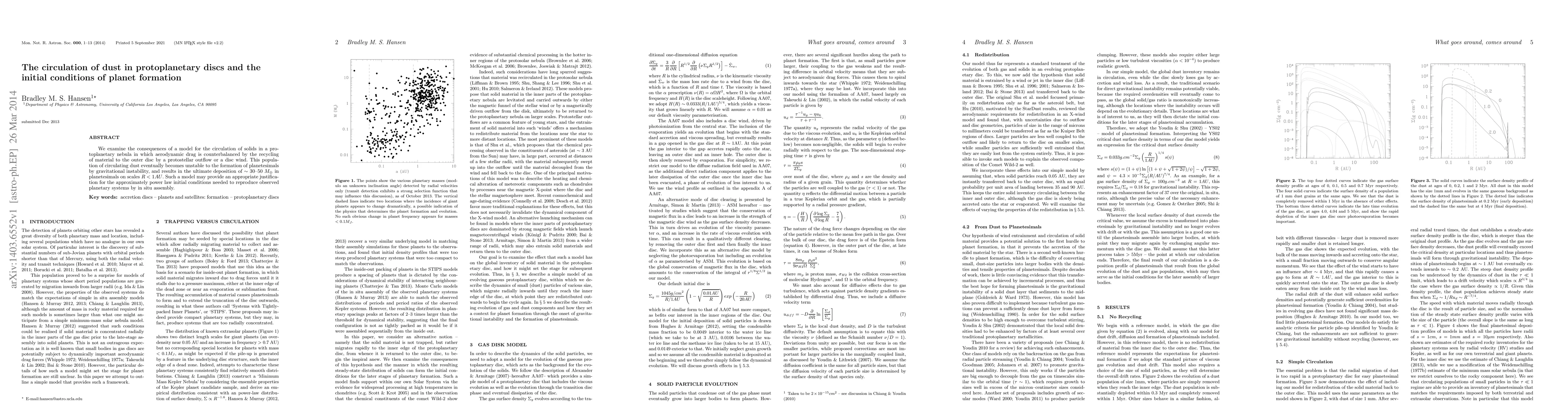 We examine the consequences of a model for the circulation of solids in a protoplanetary nebula in which aerodynamic drag is counterbalanced by the recycling of material to the outer disc by a protostellar outflow or a disc wind. This population of circulating dust eventually becomes unstable to the formation of planetesimals by gravitational instability, and results in the ultimate deposition of 30--50 earth masses in planetesimals on scales R< 1 AU. Such a model may provide an appropriate justification for the approximately power law initial conditions needed to reproduce observed planetary systems by in situ assembly.