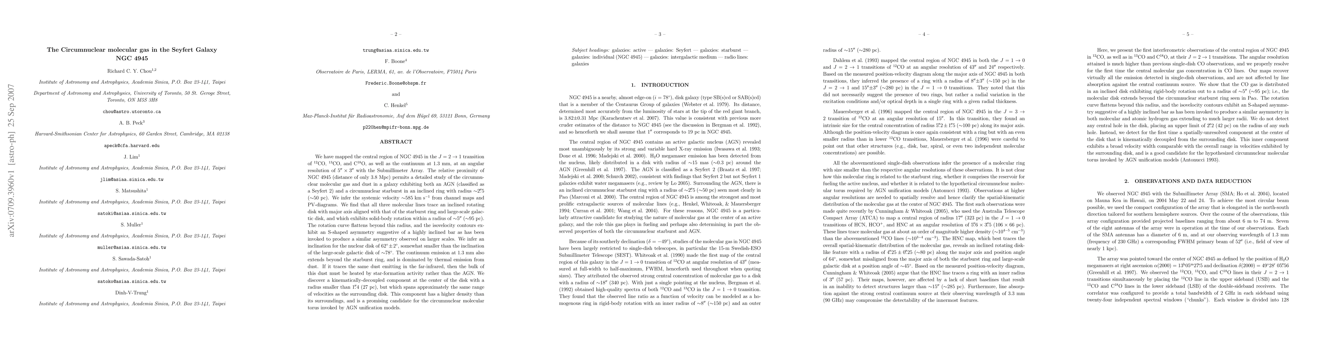 This study maps the central region of the Seyfert galaxy NGC 4945, revealing an inclined rotating disk of molecular gas and dust aligned with the starburst ring and galactic disk. A dense, kinematically-decoupled component at the center suggests a circumnuclear molecular torus, likely heated by star-formation rather than the AGN.