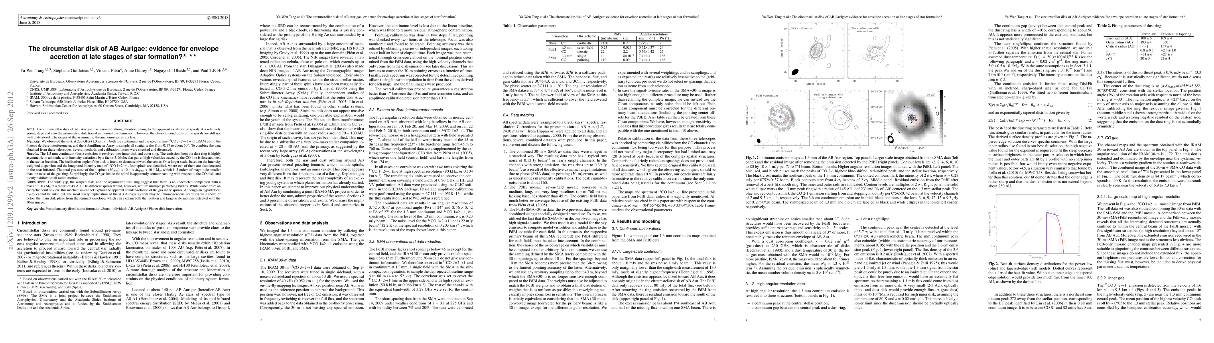 New observations reveal a circumstellar disk in AB Aurigae with four spirals, suggesting inhomogeneous accretion from the remnant envelope as the likely explanation for its rotation and large-scale motions.