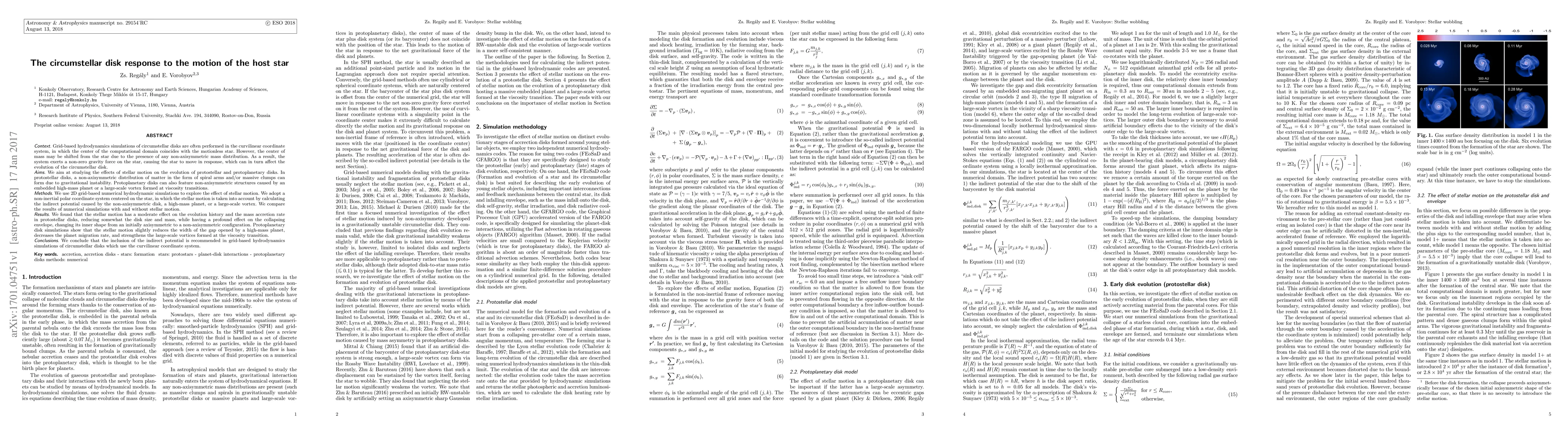 Grid-based hydrodynamics simulations of circumstellar disks are often performed in the curvilinear coordinate system, in which the center of the computational domain coincides with the motionless star. However, the center of mass may be shifted from the star due to the presence of any non-axisymmetric mass distribution. As a result, the system exerts a gravity force on the star, causing the star to move in response, which can affect the evolution of the circumstellar disk. We aim at studying the effects of stellar motion on the evolution of protostellar and protoplanetary disks. In protostellar disks, a non-axisymmetric distribution of matter in the form of spiral arms or massive clumps can form due to gravitational instability. Protoplanetary disks can also feature non-axisymmetric structures caused by a high-mass planet or a large-scale vortex. We use 2D grid-based hydrodynamic simulations to explore the effect of stellar motion. We adopt a non-inertial polar coordinate system centered on the star, in which the stellar motion is taken into account by calculating the indirect potential caused by the non-axisymmetric disk, a high-mass planet, or a large-scale vortex. We found that the stellar motion has a moderate effect on the evolution history in protostellar disks, reducing somewhat the disk size and mass, while having a profound effect on the collapsing envelope, changing its inner shape from an initially axisymmetric to a non-axisymmetric configuration. Protoplanetary disk simulations show that the stellar motion slightly reduces the width of the gap opened by a high-mass planet, decreases the planet migration rate, and strengthens the large-scale vortices formed at the viscosity transition. We conclude that the inclusion of the indirect potential is recommended in grid-based hydrodynamics simulations of circumstellar disks which use the curvilinear coordinate system.