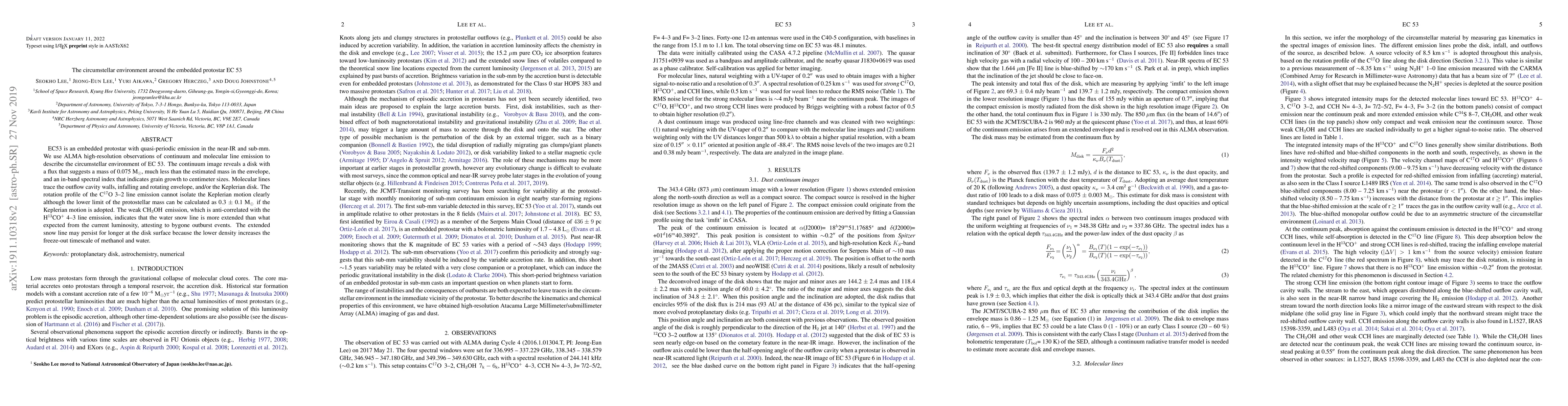 EC53 is an embedded protostar with quasi-periodic emission in the near-IR and sub-mm. We use ALMA high-resolution observations of continuum and molecular line emission to describe the circumstellar environment of EC 53. The continuum image reveals a disk with a flux that suggests a mass of 0.075 Msun, much less than the estimated mass in the envelope, and an in-band spectral index that indicates grain growth to centimeter sizes. Molecular lines trace the outflow cavity walls, infalling and rotating envelope, and/or the Keplerian disk. The rotation profile of the C17O 3-2 line emission cannot isolate the Keplerian motion clearly although the lower limit of the protostellar mass can be calculated as 0.3 +- 0.1 Msun if the Keplerian motion is adopted. The weak CH3OH emission, which is anti-correlated with the HCO+ 4-3 line emission, indicates that the water snow line is more extended than what expected from the current luminosity, attesting to bygone outburst events. The extended snow line may persist for longer at the disk surface because the lower density increases the freeze-out timescale of methanol and water.