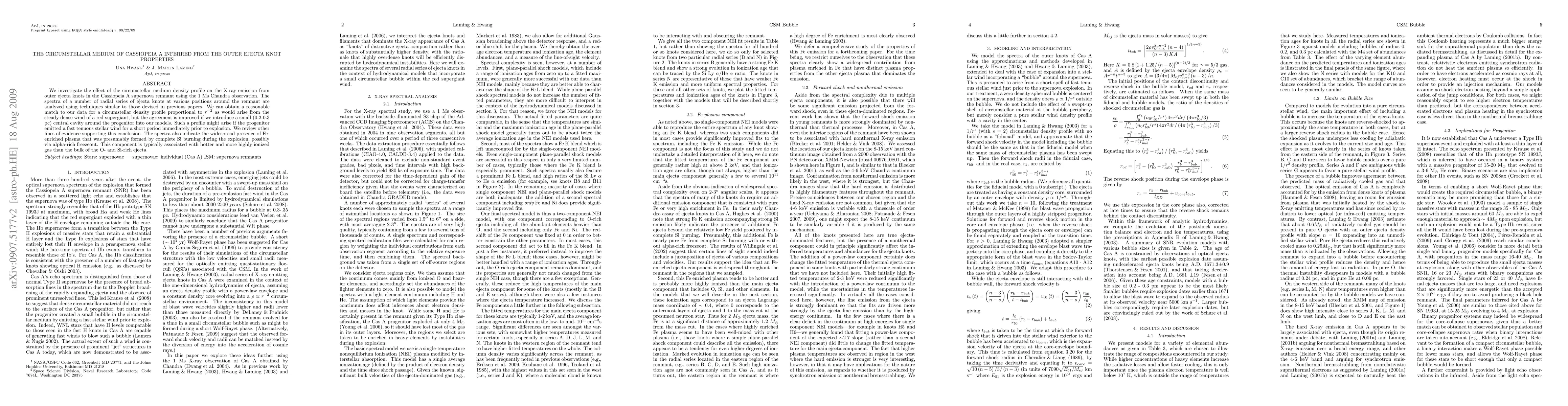 This paper analyzes the X-ray emission from the outer ejecta knots in Cassiopeia A, finding that a circumstellar density profile proportional to r^-2, possibly from a red supergiant wind, best matches the data, though a small central cavity improves the fit. The study also reveals Fe-enriched plasma likely formed by complete Si burning during the supernova explosion.