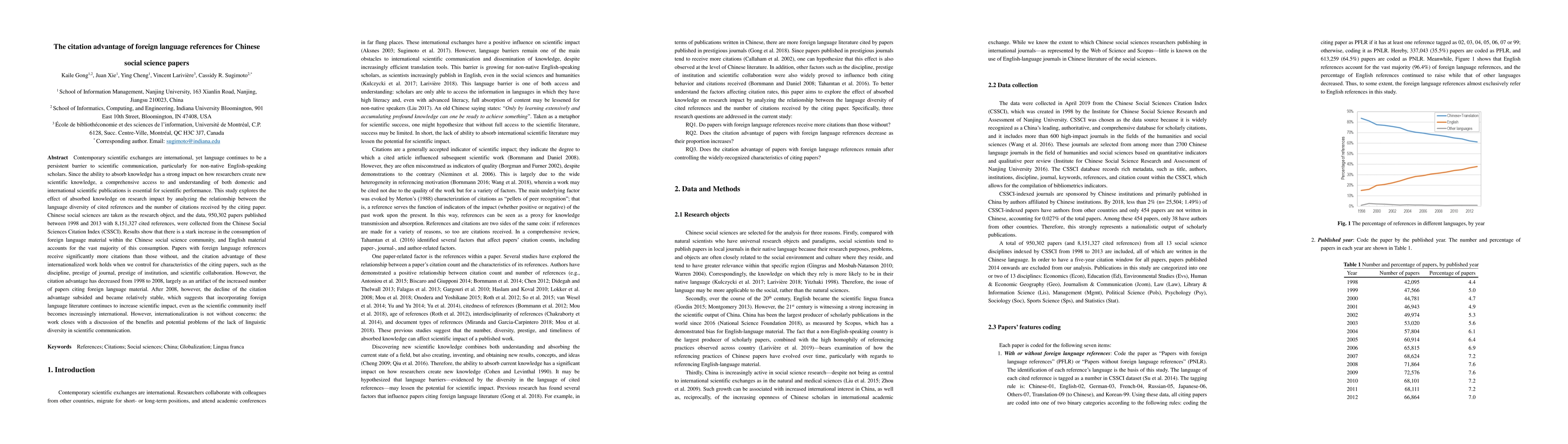 This study investigates the citation advantage of foreign language references in Chinese social science papers, finding that papers citing foreign references, especially in English, receive significantly more citations. The citation advantage has fluctuated over time but stabilized after 2008, indicating ongoing benefits of internationalized research despite concerns about linguistic diversity in scientific communication.