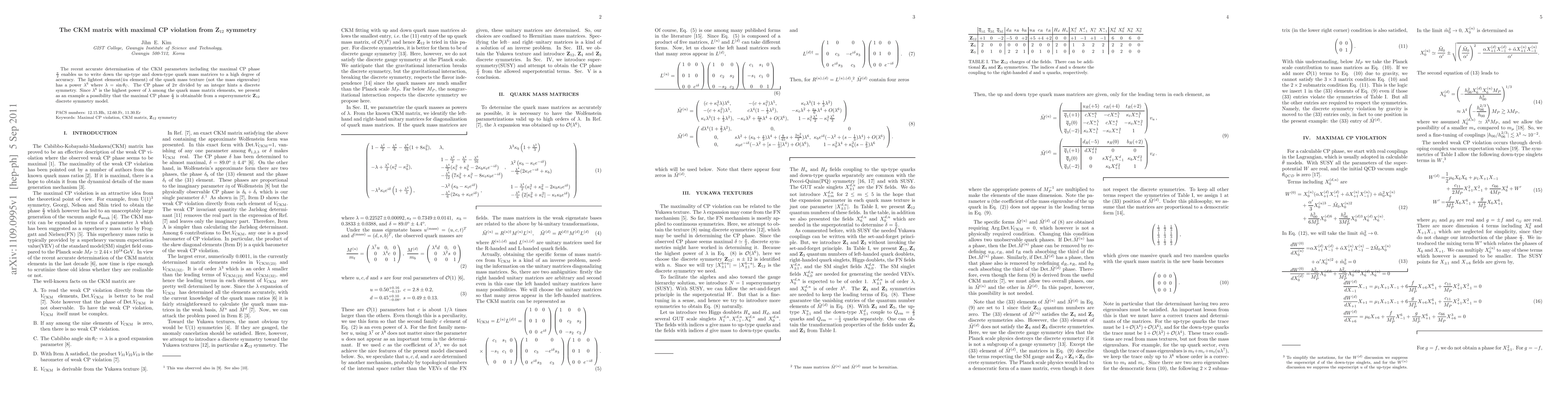 This paper explores the connection between the CKM matrix's maximal CP violation and a supersymmetric Z(12) discrete symmetry, proposing that the highest power of lambda (sin(Cabibbo angle)) in the quark mass matrix can be derived from this symmetry model. The study suggests that the maximal CP phase of 90 degrees is achievable within this framework.