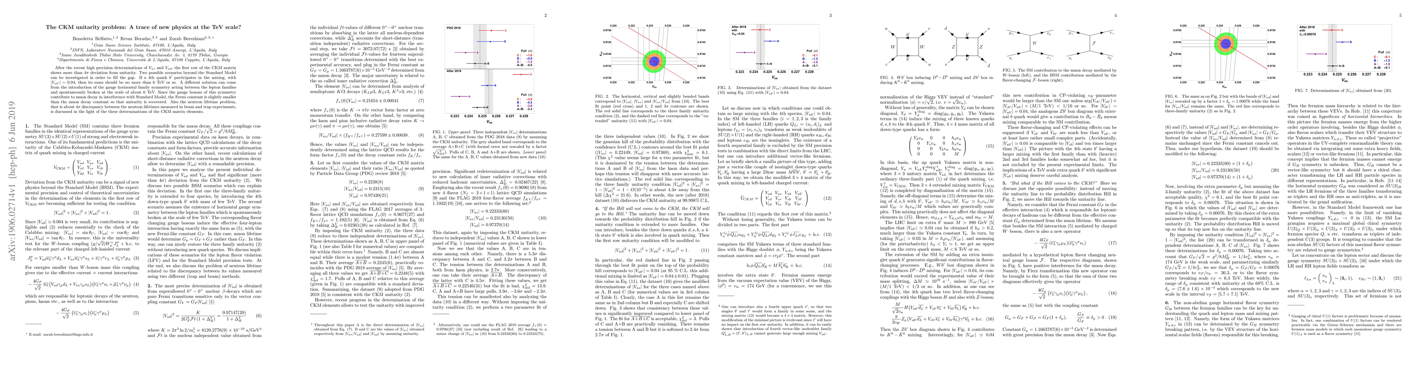 After the recent high precision determinations of $V_{us}$ and $V_{ud}$, the first row of the CKM matrix shows more than $4\sigma$ deviation from unitarity. Two possible scenarios beyond the Standard Model can be investigated in order to fill the gap. If a 4th quark $b'$ participates in the mixing, with $\vert V_{ub'} \vert \sim0.04$, then its mass should be no more than 6 TeV or so. A different solution can come from the introduction of the gauge horizontal family symmetry acting between the lepton families and spontaneously broken at the scale of about 6 TeV. Since the gauge bosons of this symmetry contribute to muon decay in positive interference with Standard Model, the Fermi constant is slightly smaller than the muon decay constant so that unitarity is recovered. Also the neutron lifetime problem, that is about $4\sigma$ discrepancy between the neutron lifetimes measured in beam and trap experiments, is discussed in the light of the these determinations of the CKM matrix elements.
