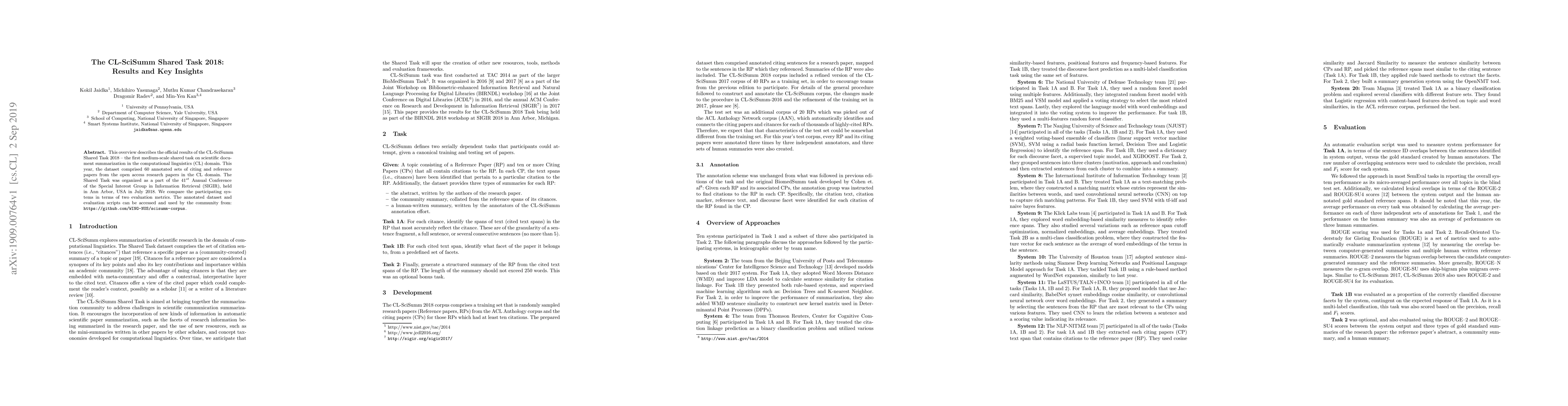 The CL-SciSumm Shared Task 2018 evaluated 60 annotated sets of scientific document summaries, comparing participating systems using two evaluation metrics. The study provides insights into the state-of-the-art in scientific document summarization.