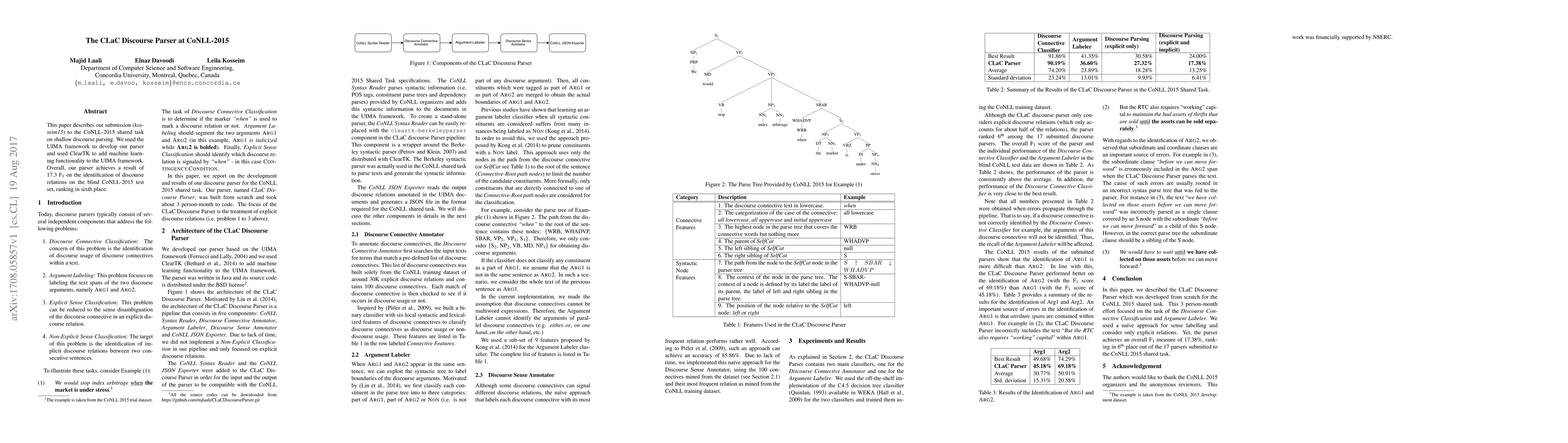 This paper presents the CLaC Discourse Parser, developed using the UIMA framework and enhanced with ClearTK for machine learning, which achieved a 17.3 F1 score in the CoNLL-2015 shallow discourse parsing task, ranking sixth.