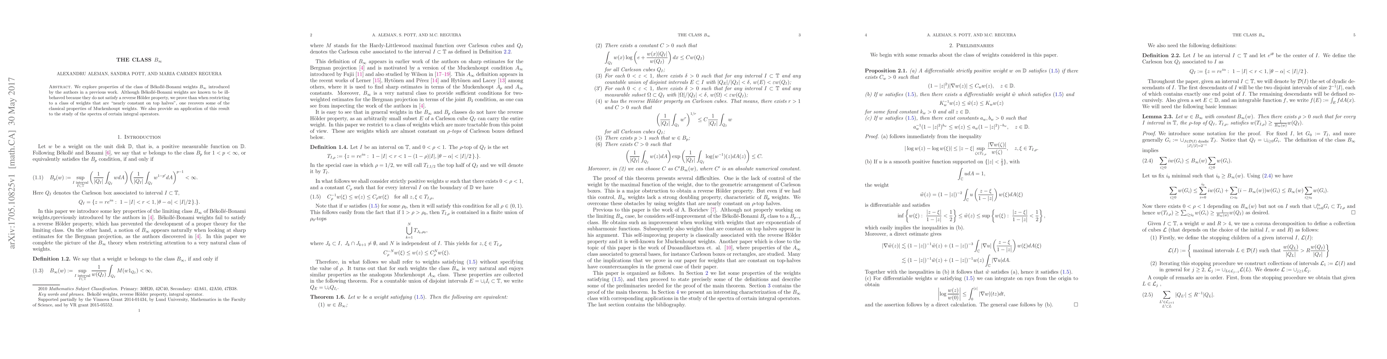 We explore properties of the class of B\'ekoll\'e-Bonami weights $B_\infty$ introduced by the authors in a previous work. Although B\'ekoll\'e-Bonami weights are known to be ill-behaved because they do not satisfy a reverse H\"older property, we prove than when restricting to a class of weights that are "nearly constant on top halves", one recovers some of the classical properties of Muckenhoupt weights. We also provide an application of this result to the study of the spectra of certain integral operators.
