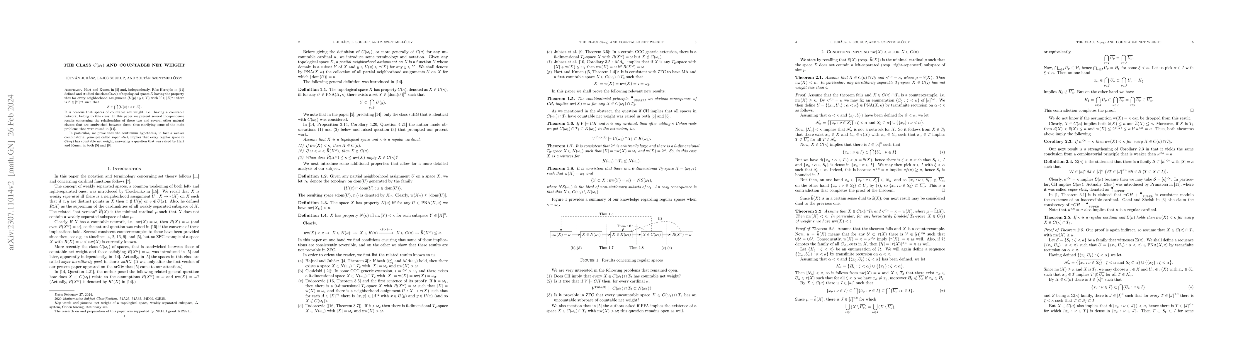 Hart and Kunen, and independently in the recent preprint arXiv:2304.13113, R\'ios-Herrej\'on defined and studied the class $C({\omega}_1)$ of topological spaces $X$ having the property that for every neighborhood assignment $\{U(y) : y \in Y\}$ with $Y \in [X]^{\omega_1}$ there is $Z \in [Y]^{\omega_1}$ such that $$Z \subset \bigcap \{U(z) : z \in Z\}.$$ It is obvious that spaces of countable net weight, i.e. having a countable network, belong to this class. In this paper we present several independence results concerning the relationships of these and several other classes that are sandwiched between them. These clarify some of the main problems that were raised in the above preprint. In particular, we prove that the continuum hypothesis, in fact a weaker combinatorial principle called super stick, implies that every regular space in $C(\omega_1)$ has countable net weight, answering a question that was raised by Hart and Kunen.