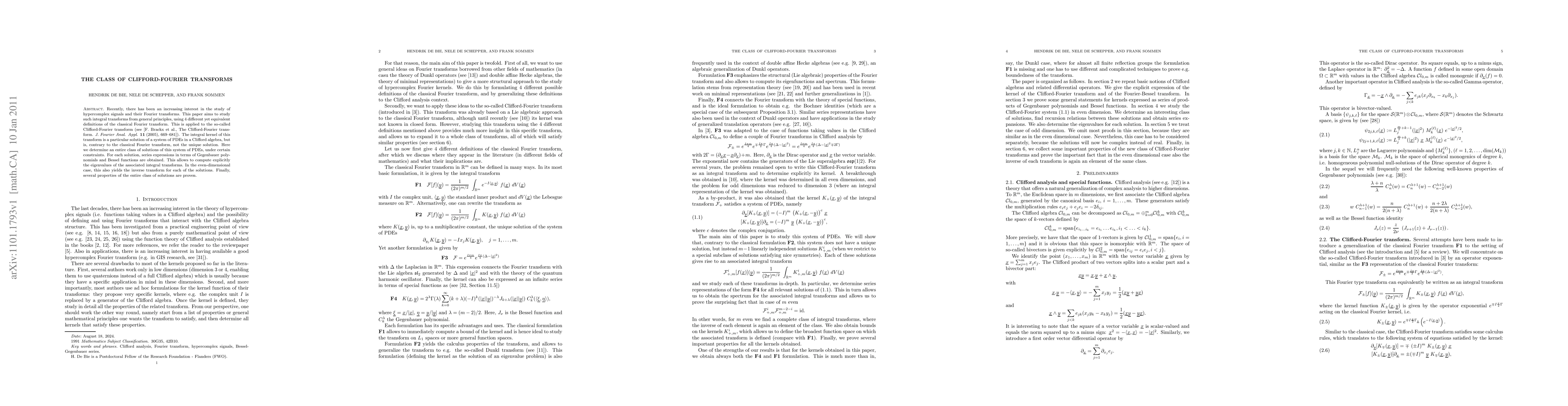 This paper explores the Clifford-Fourier transforms, deriving an entire class of solutions based on a system of PDEs in Clifford algebra. It provides series expressions for these solutions using Gegenbauer polynomials and Bessel functions, and proves several properties of the resulting class.