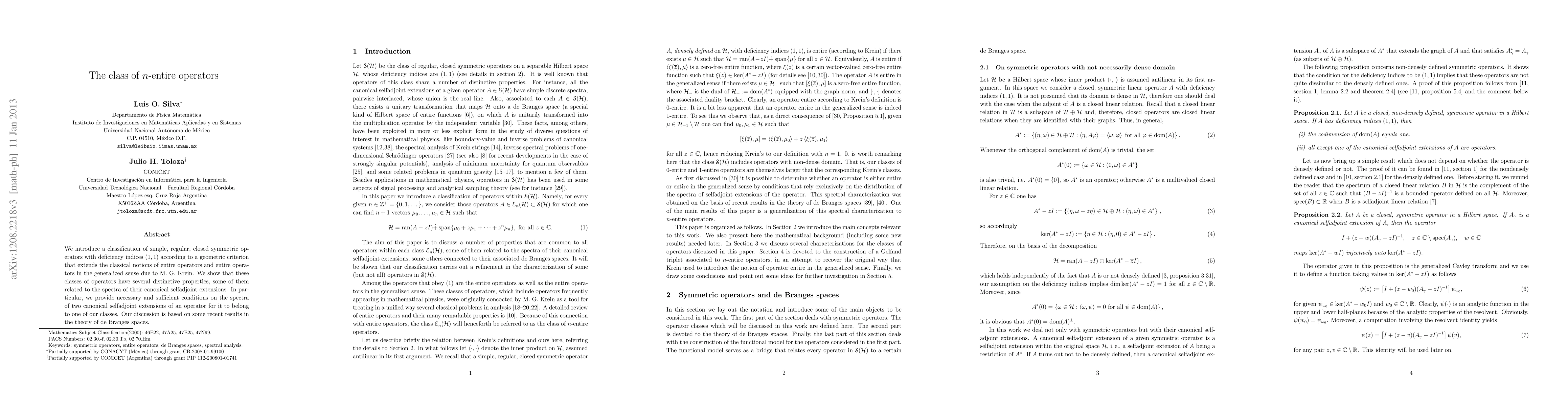 We introduce a classification of simple, regular, closed symmetric operators with deficiency indices (1,1) according to a geometric criterion that extends the classical notions of entire operators and entire operators in the generalized sense due to M. G. Krein. We show that these classes of operators have several distinctive properties, some of them related to the spectra of their canonical selfadjoint extensions. In particular, we provide necessary and sufficient conditions on the spectra of two canonical selfadjoint extensions of an operator for it to belong to one of our classes. Our discussion is based on some recent results in the theory of de Branges spaces.