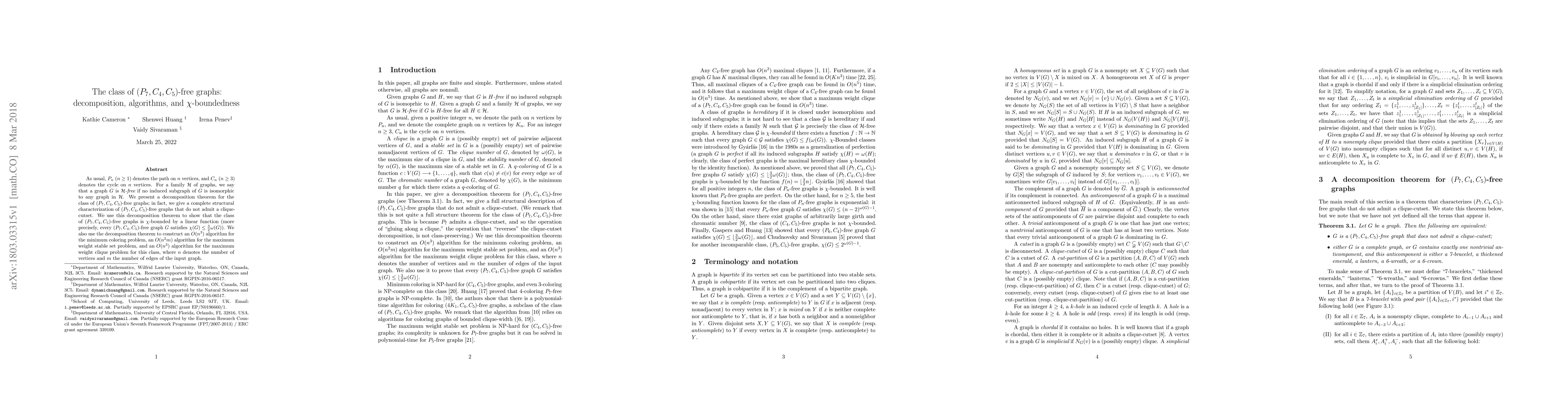 As usual, $P_n$ ($n \geq 1$) denotes the path on $n$ vertices, and $C_n$ ($n \geq 3$) denotes the cycle on $n$ vertices. For a family $\mathcal{H}$ of graphs, we say that a graph $G$ is $\mathcal{H}$-free if no induced subgraph of $G$ is isomorphic to any graph in $\mathcal{H}$. We present a decomposition theorem for the class of $(P_7,C_4,C_5)$-free graphs; in fact, we give a complete structural characterization of $(P_7,C_4,C_5)$-free graphs that do not admit a clique-cutset. We use this decomposition theorem to show that the class of $(P_7,C_4,C_5)$-free graphs is $\chi$-bounded by a linear function (more precisely, every $(P_7,C_4,C_5)$-free graph $G$ satisfies $\chi(G) \leq \frac{3}{2} \omega(G)$). We also use the decomposition theorem to construct an $O(n^3)$ algorithm for the minimum coloring problem, an $O(n^2m)$ algorithm for the maximum weight stable set problem, and an $O(n^3)$ algorithm for the maximum weight clique problem for this class, where $n$ denotes the number of vertices and $m$ the number of edges of the input graph.