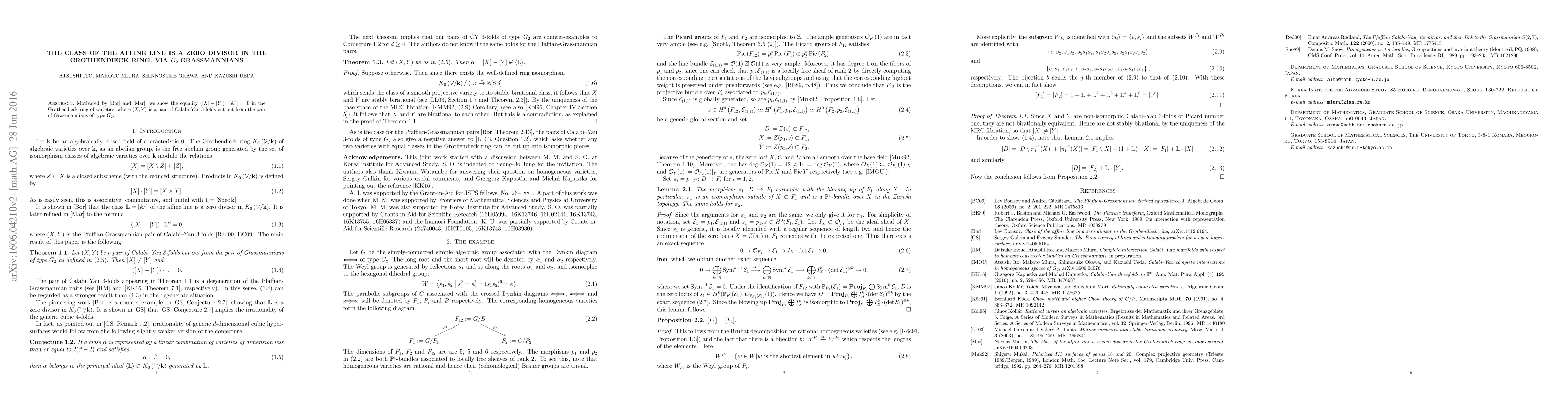 This paper demonstrates that the affine line $\mathbb{A}^1$ acts as a zero divisor in the Grothendieck ring of varieties, showing the relation $\left([X] - [Y]\right) \cdot [\mathbb{A}^1] = 0$ for specific Calabi-Yau 3-folds $X$ and $Y$ derived from $G_2$-Grassmannians.