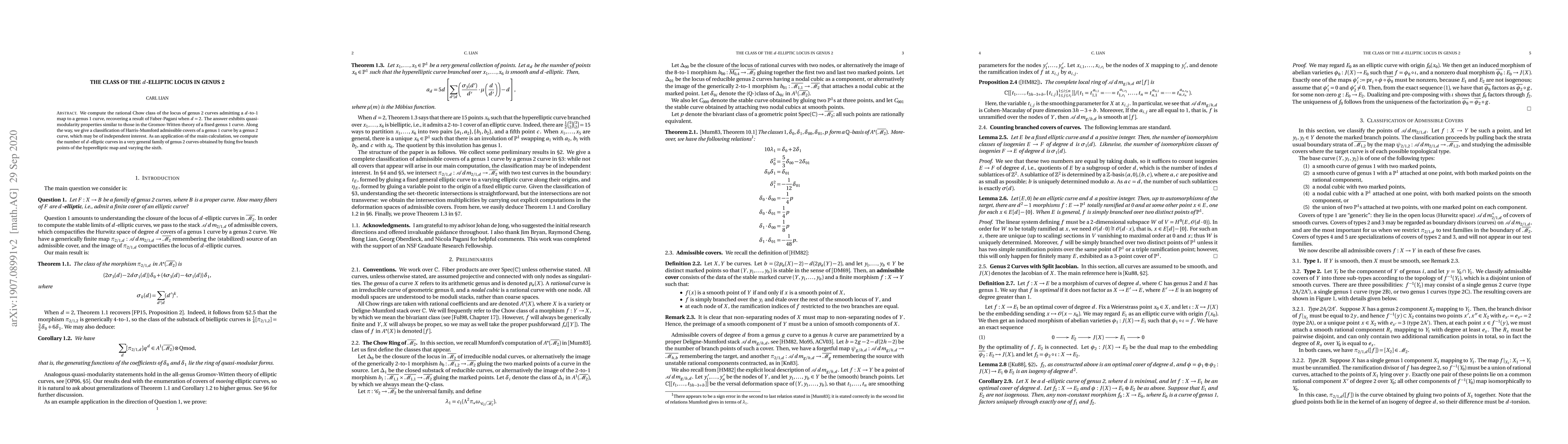 Researchers computed the rational Chow class of genus 2 curves with a d-to-1 map to a genus 1 curve, recovering a previous result for d=2, and found quasi-modularity properties similar to Gromov-Witten theory.