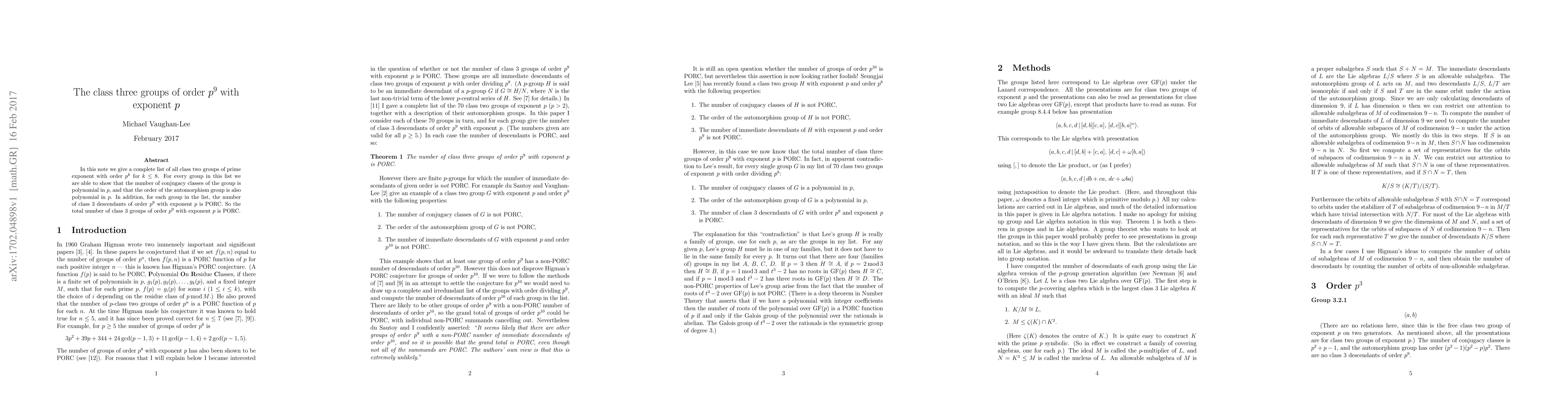 We give a complete list of the class two groups with exponent $p$ and order dividing $p^8$. For each group in the list we compute the number of immediate descendants of order $p^9$ with exponent $p$. In each case the number of descendants is PORC, and so the total number of class three groups of order $p^9$ with exponent $p$ is PORC. Nevertheless, there are groups of order $p^8$ with exponent $p$ which have a non-PORC number of class three descendants of order $p^9$ with exponent $p$.