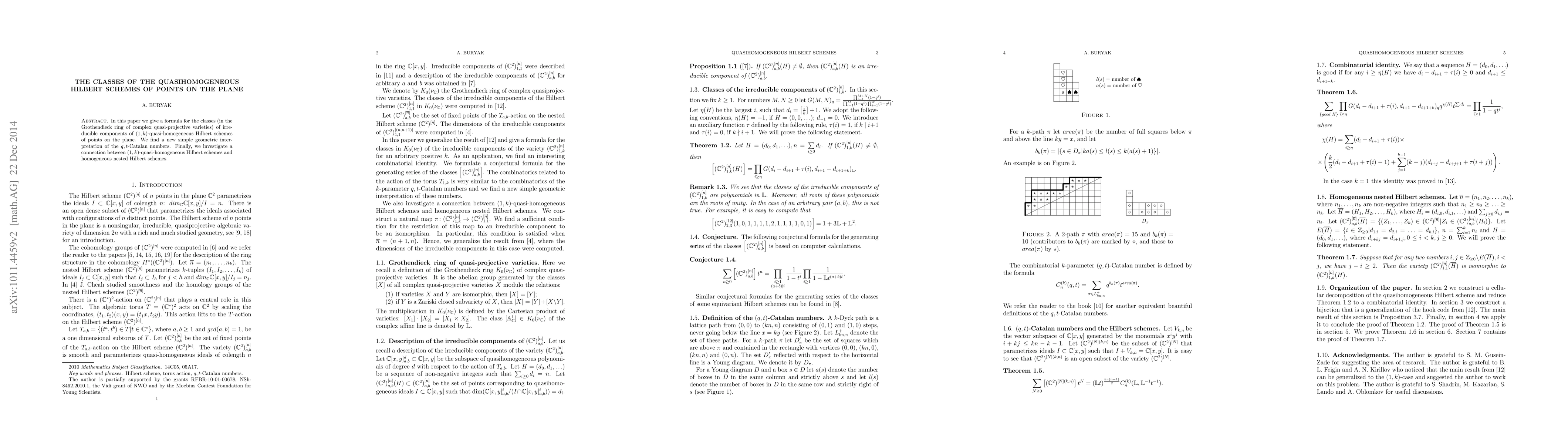 This paper provides a formula for the classes of irreducible components in the Grothendieck ring of $(1,k)$-quasi-homogeneous Hilbert schemes of points on the plane, reveals a geometric interpretation of $q,t$-Catalan numbers, and explores connections to homogeneous nested Hilbert schemes.