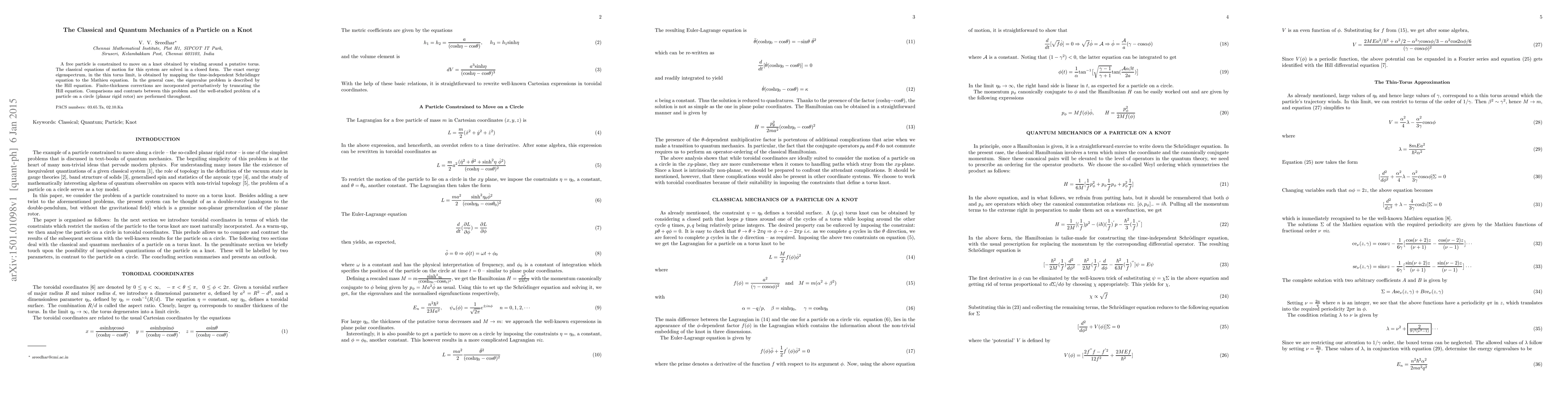 A free particle is constrained to move on a knot obtained by winding around a putative torus. The classical equations of motion for this system are solved in a closed form. The exact energy eigenspectrum, in the thin torus limit, is obtained by mapping the time-independent Schrodinger equation to the Mathieu equation. In the general case, the eigenvalue problem is described by the Hill equation. Finite-thickness corrections are incorporated perturbatively by truncating the Hill equation. Comparisons and contrasts between this problem and the well-studied problem of a particle on a circle (planar rigid rotor) are performed throughout.