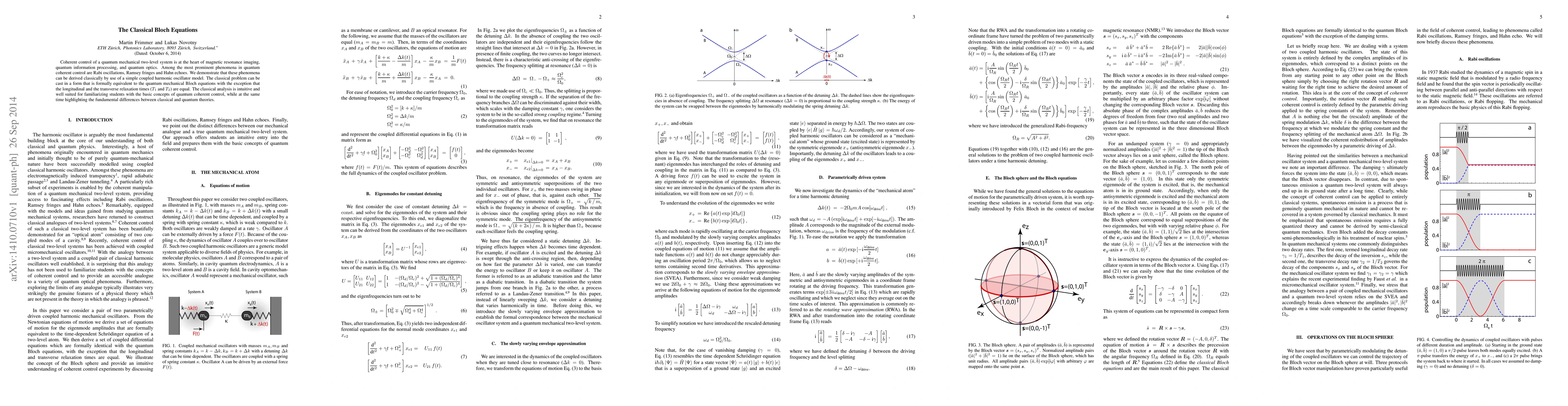 Coherent control of a quantum mechanical two-level system is at the heart of magnetic resonance imaging, quantum information processing, and quantum optics. Among the most prominent phenomena in quantum coherent control are Rabi oscillations, Ramsey fringes and Hahn echoes. We demonstrate that these phenomena can be derived classically by use of a simple coupled harmonic oscillator model. The classical problem can be cast in a form that is formally equivalent to the quantum mechanical Bloch equations with the exception that the longitudinal and the transverse relaxation times ($T_1$ and $T_2$) are equal. The classical analysis is intuitive and well suited for familiarizing students with the basic concepts of quantum coherent control, while at the same time highlighting the fundamental differences between classical and quantum theories.