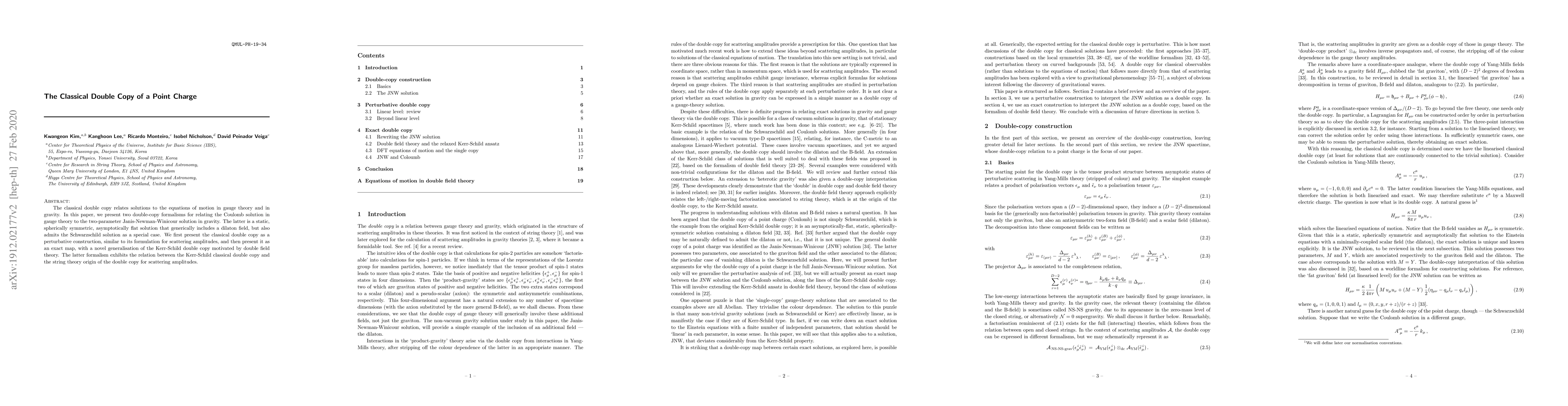 This paper explores two classical double-copy formalisms to relate the Coulomb solution in gauge theory to the Janis-Newman-Winicour solution in gravity, highlighting a novel generalisation of the Kerr-Schild double copy inspired by double field theory. It demonstrates the connection between the Kerr-Schild formalism and the string theory origin of the double copy for scattering amplitudes.