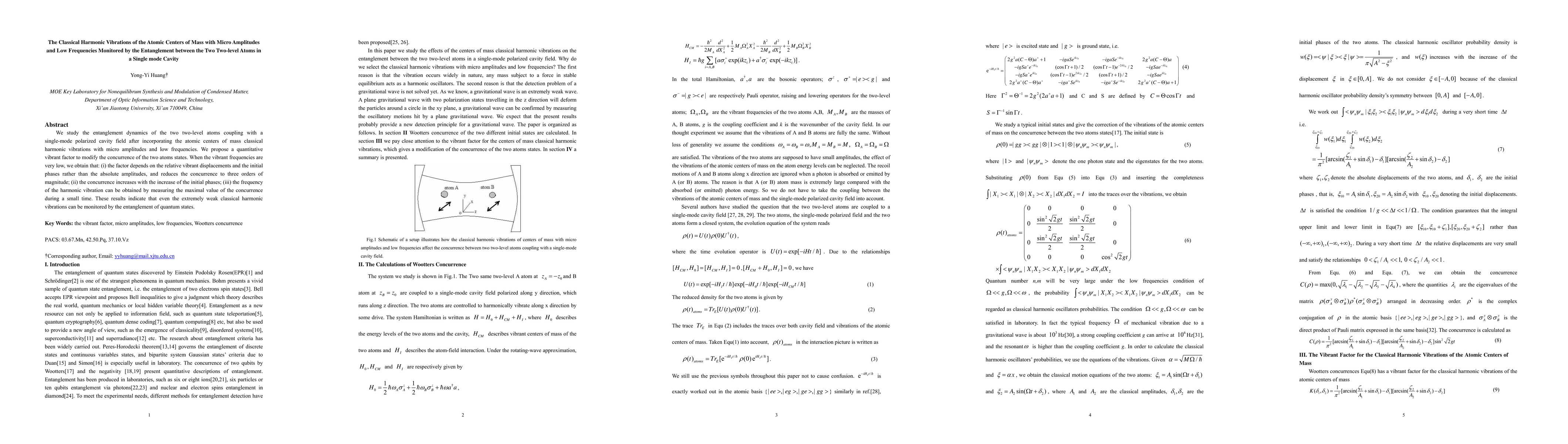 We study the entanglement dynamics of the two two-level atoms coupling with a single-mode polarized cavity field after incorporating the atomic centers of mass classical harmonic vibrations with micro amplitudes and low frequencies. We propose a quantitative vibrant factor to modify the concurrence of the two atoms states. When the vibrant frequencies are very low, we obtain that: (i) the factor depends on the relative vibrant displacements and the initial phases rather than the absolute amplitudes, and reduces the concurrence to three orders of magnitude; (ii) the concurrence increases with the increase of the initial phases; (iii) the frequency of the harmonic vibration can be obtained by measuring the maximal value of the concurrence during a small time. These results indicate that even the extremely weak classical harmonic vibrations can be monitored by the entanglement of quantum states.