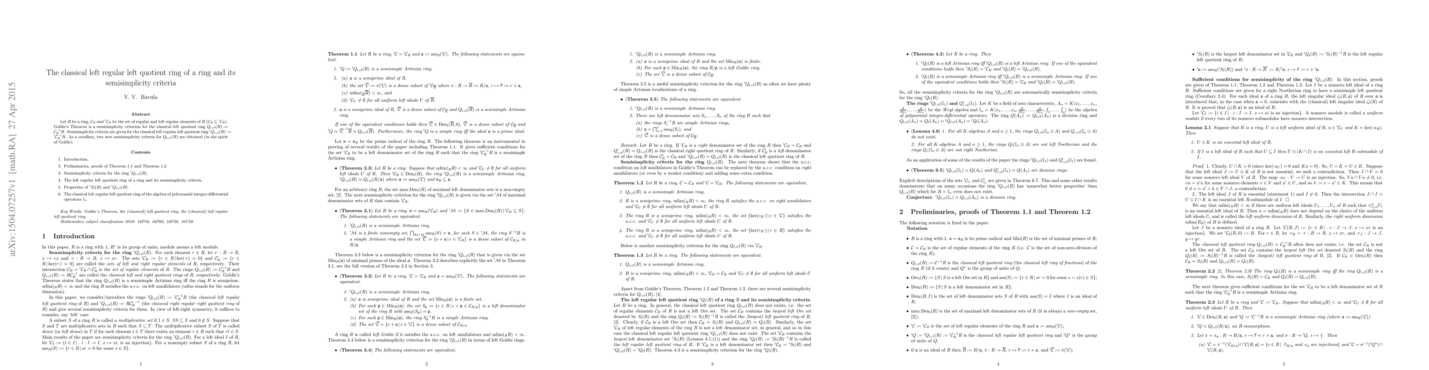 This paper investigates semisimplicity criteria for the classical left quotient ring of a ring, focusing on regular elements and their implications for Goldie's Theorem.