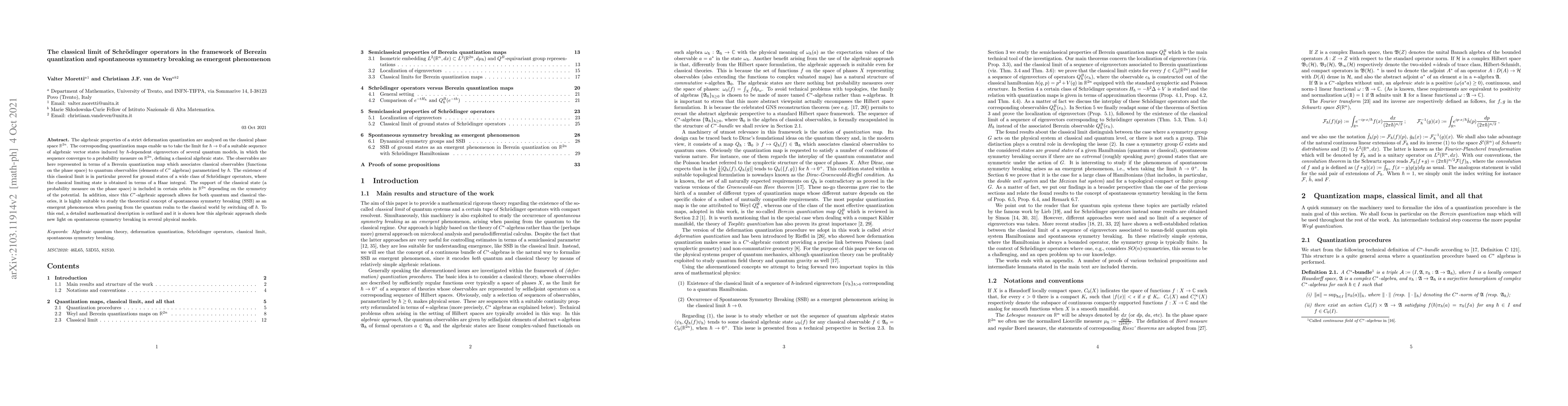 This paper analyzes the classical limit of Schrödinger operators through Berezin quantization, demonstrating the convergence of quantum states to classical algebraic states as $\hbar \to 0$. It also explores spontaneous symmetry breaking as an emergent phenomenon in the transition from quantum to classical theories.