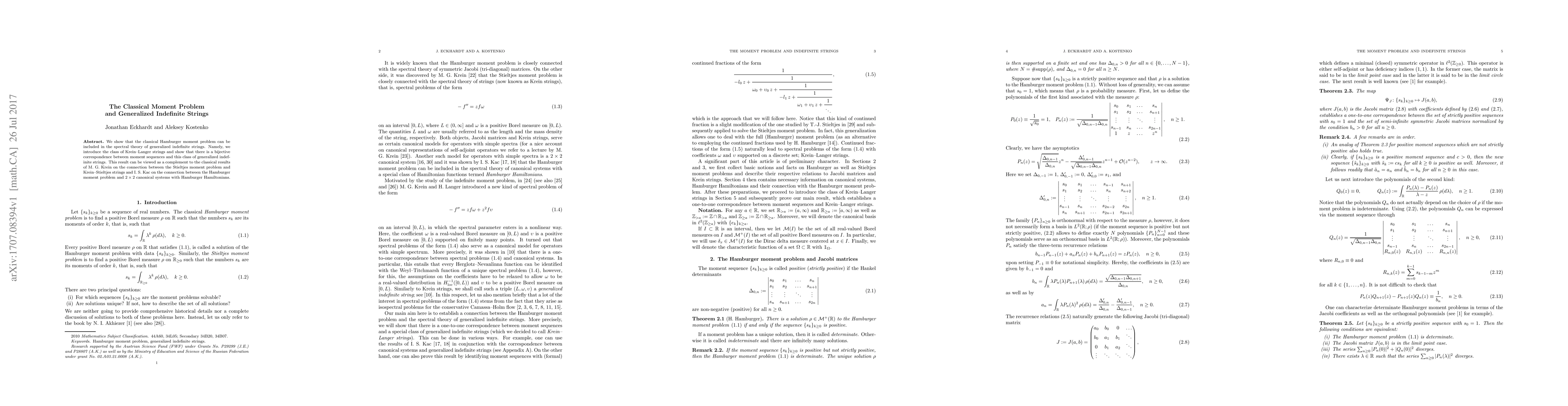 This paper establishes a connection between the classical Hamburger moment problem and the spectral theory of generalized indefinite strings, specifically through Krein-Langer strings, providing a bijective correspondence between moment sequences and this class. This extends classical results linking moment problems to specific canonical systems.
