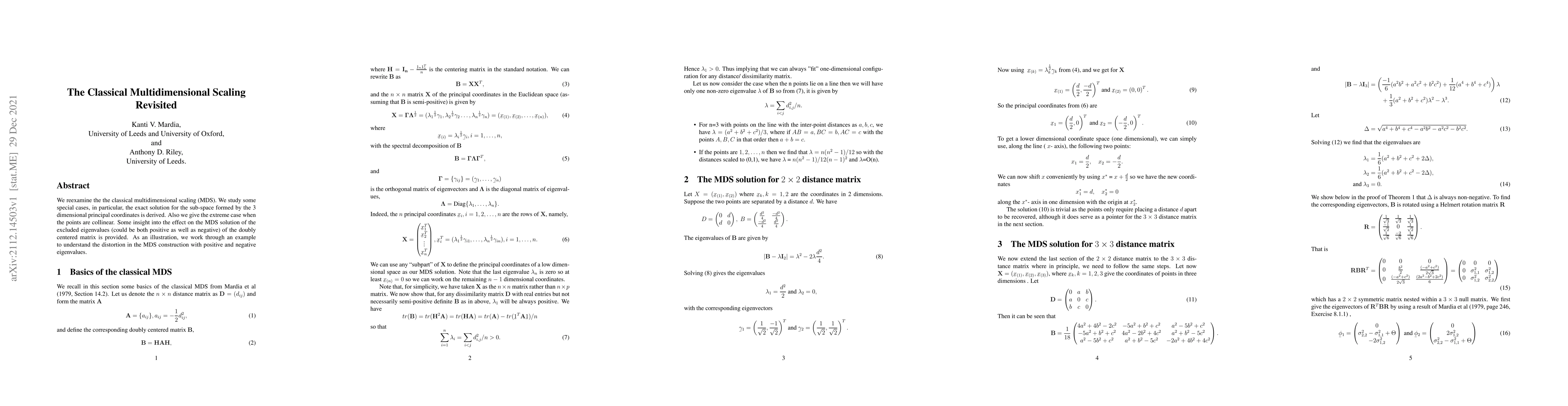 This paper revisits classical multidimensional scaling (MDS), deriving the exact solution for the 3-dimensional subspace and examining the case when points are collinear. It also explores the impact of excluding eigenvalues on MDS solutions, illustrated with an example showing distortions from positive and negative eigenvalues.