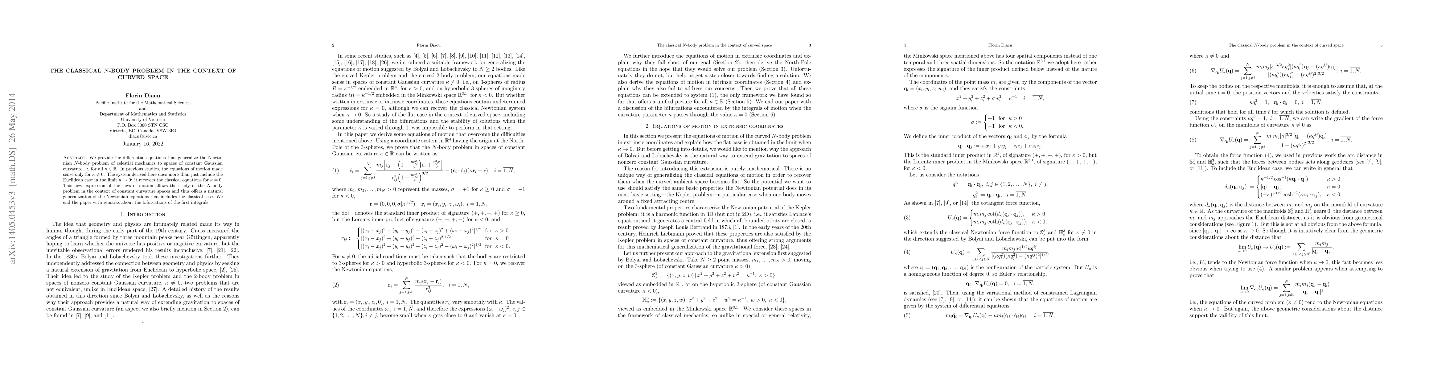 We provide the differential equations that generalize the Newtonian N-body problem of celestial mechanics to spaces of constant Gaussian curvature, k, for all k real. In previous studies, the equations of motion made sense only for k nonzero. The system derived here does more than just include the Euclidean case in the limit when k tends to 0: it recovers the classical equations for k=0. This new expression of the laws of motion allows the study of the N-body problem in the context of constant curvature spaces and thus offers a natural generalization of the Newtonian equations that includes the classical case. We end the paper with remarks about the bifurcations of the first integrals.