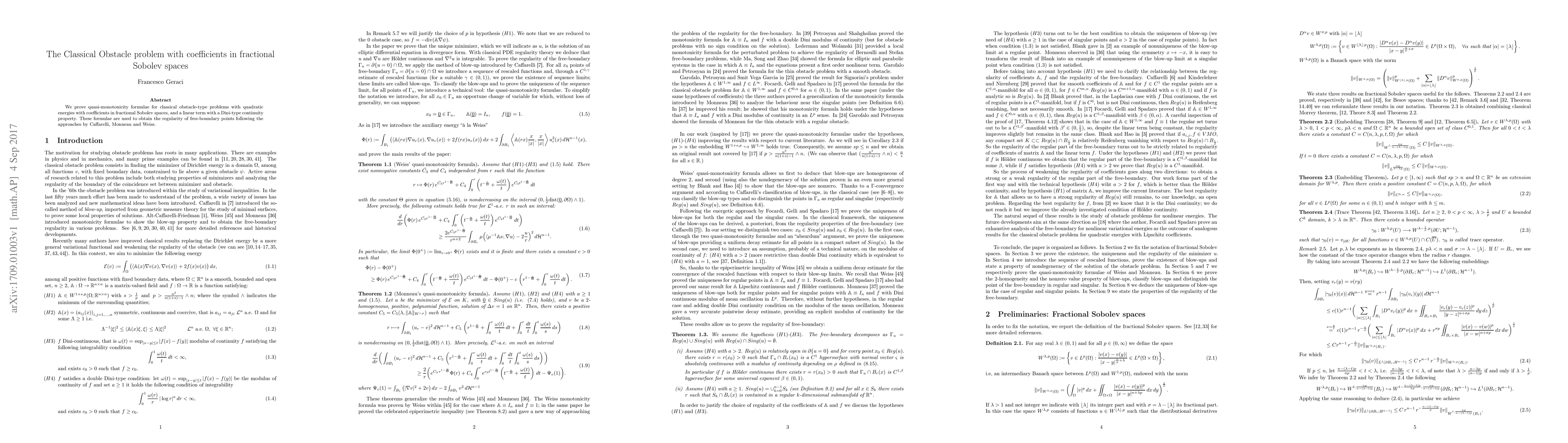Summary: This paper establishes quasi-monotonicity formulae for classical obstacle problems with coefficients in fractional Sobolev spaces and linear terms with Dini-type continuity, leading to the regularity of free-boundary points, inspired by Caffarelli, Monneau, and Weiss's methods.